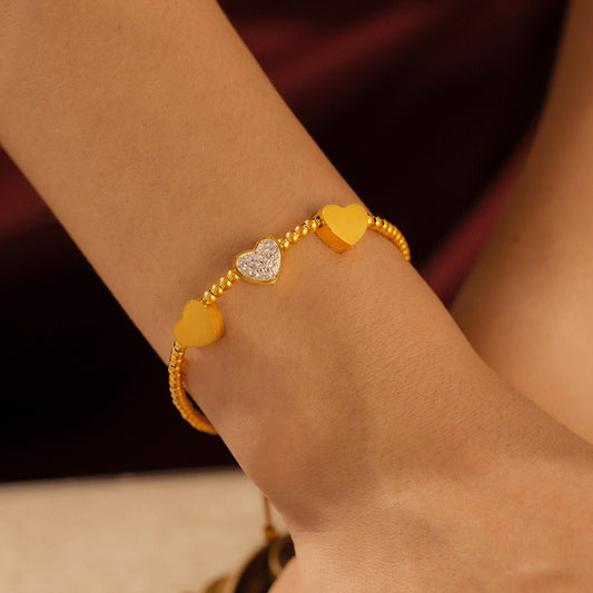 B廠【E542】歐美跨境桃心鑲鑽圓珠手鍊新款簡約氣質設計鈦鋼鍍18k金抽拉手鍊 24.07-3