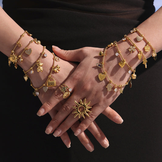 B廠【E632】國潮新款不鏽鋼DIY多配件手鍊女太陽草帽空心吊飾鍍18k真金 25.05-5
