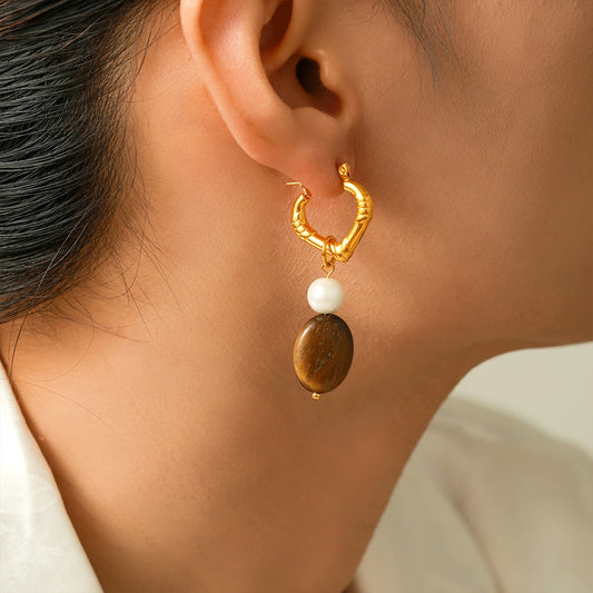 B廠【F1581】歐美跨境新款虎眼石串仿珍珠吊墜愛心耳環不鏽鋼鍍18k金小眾耳飾 24.08-4