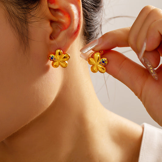 B廠【F133】赫本風時尚簡約個性花朵造型耳飾幾何鑲嵌彩鑽設計感鈦鋼鍍金耳環 24.07-2