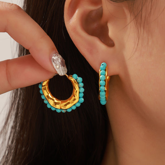 B廠【F976】歐美復古彩色天然石手工串珠耳環時尚小眾百搭鈦鋼C型鍍18k金耳飾 24.06-3