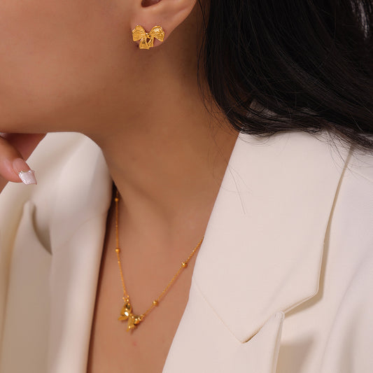 B廠【P053】小香風氣質蝴蝶結吊墜通勤百搭小眾飾品chic風鈦鋼鍍金不褪色套裝 24.06-2