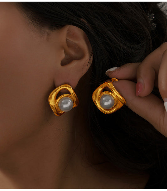 B廠【F1305-9】歐美幾何仿珍珠紋理鈦鋼鑄造耳環飾品百搭新款鍍18k真金保色套裝 24.04-3