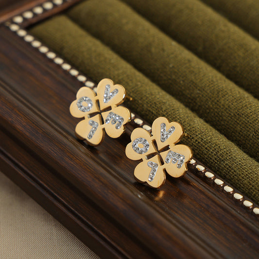 B廠【F394】跨國熱銷時尚個性簡約幾何飾品幸運草鑲鑽英文字母設計鈦鋼耳環 25.10-1