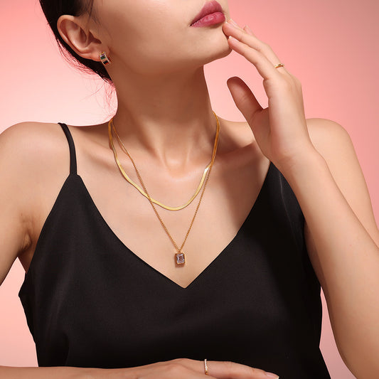 B廠【P1236】法式跨境小眾ins雙層疊戴風刀片鏈方形吊墜不銹鋼復古項鍊 24.09-1