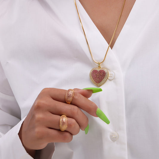 B廠【P086】歐美chic風跨境新款愛心吊墜鈦鋼項鍊開口戒指鑲滿鋯石銅鍍18k金 24.08-3