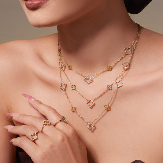 B廠【TXP505】不銹鋼鏤空花朵滿鑽鋯石耳環戒指項鍊簡約輕奢首飾組鍍18k真金 25.12-1