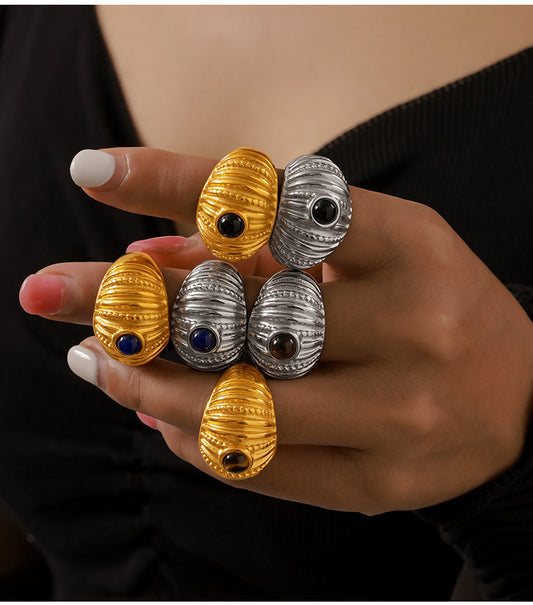 B廠【A813】跨國復古時尚個性幾何編織戒指女鈦鋼紋理鑲鑽指環黑瑪瑙 24.05-4