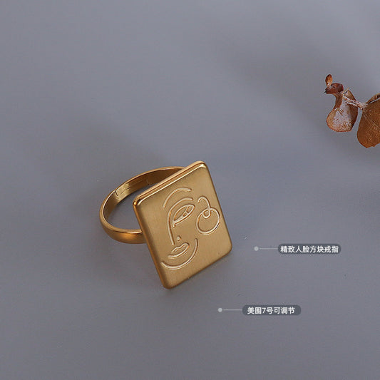 B廠【A102】Marka歐美復古ins風人臉幾何方塊戒指女不掉色鈦鋼18k金指環 24.05-3