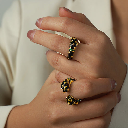 B廠【A732】時尚小眾動物滴油獵豹開口戒指高級感黑金色可調式情侶戒指潮 24.01-1