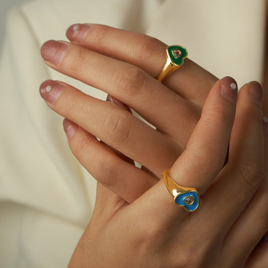 B廠【A733】網紅款砝碼彩釉愛心戒指銅鍍金屬微鑲鋯石指環時尚ins風開口對戒 24.01-2