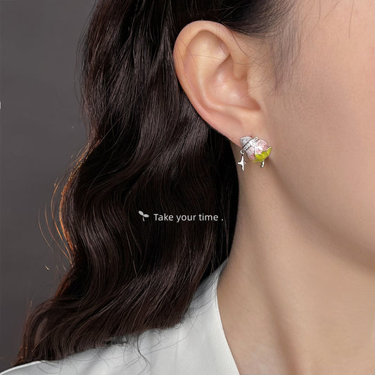 C廠【6864】洛麗塔 原創少女心漸變色925銀針微鑲鋯石彩繪粉色蕾絲花耳環耳飾 25.10-1