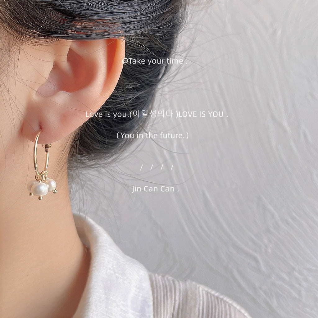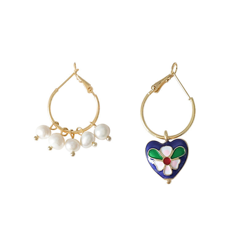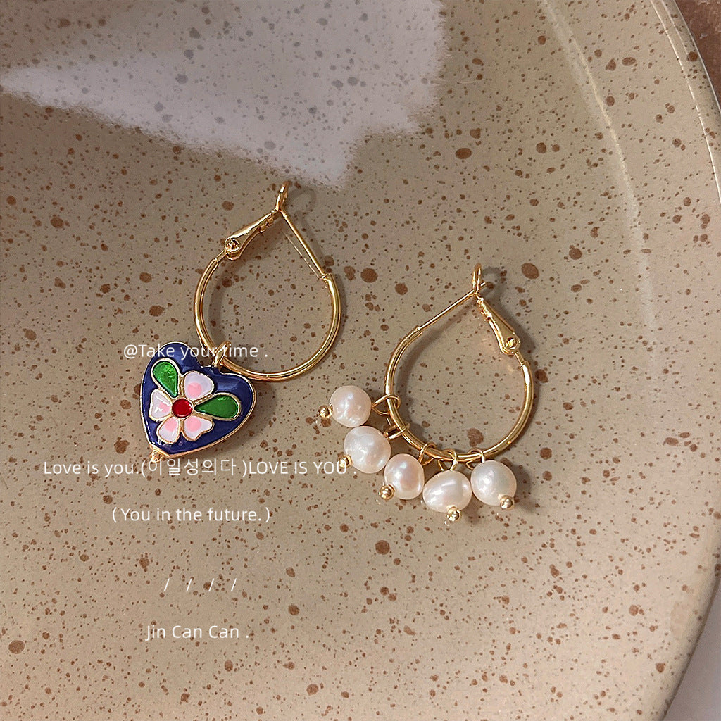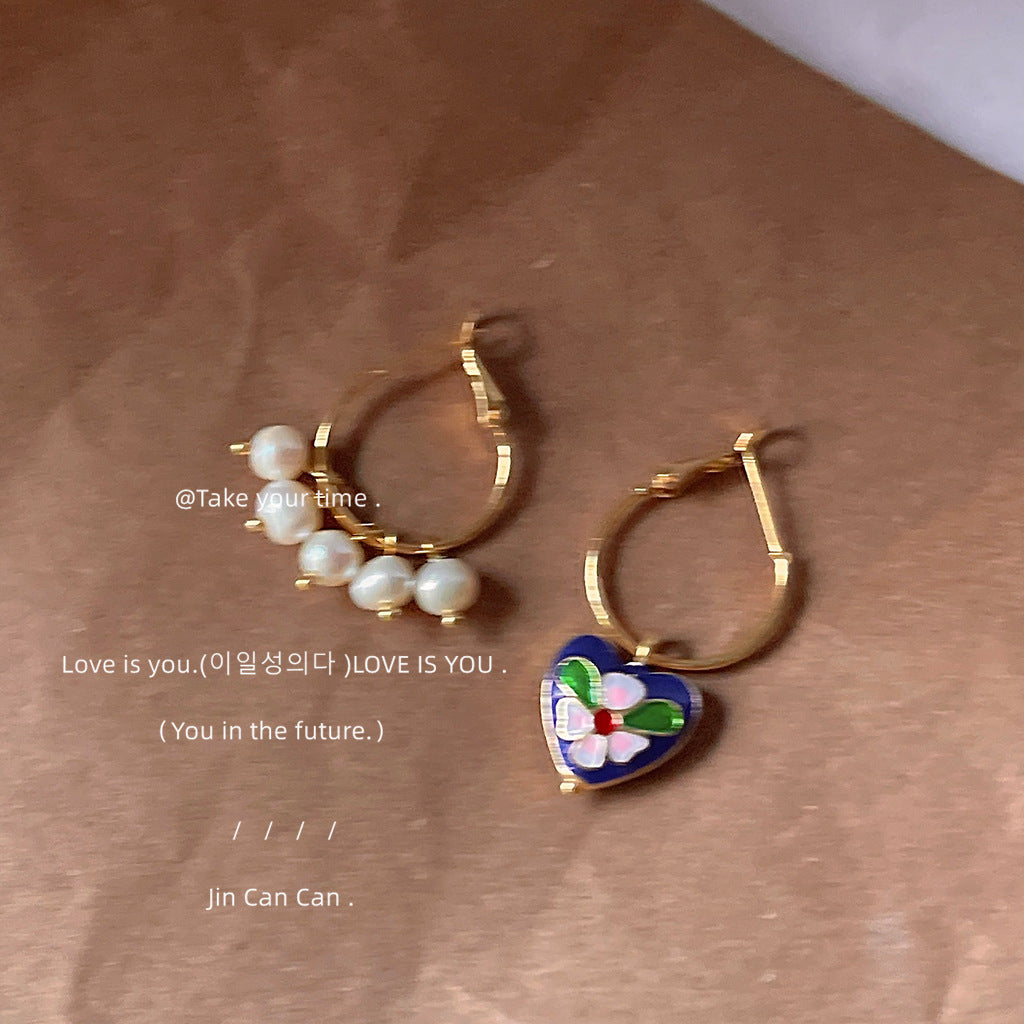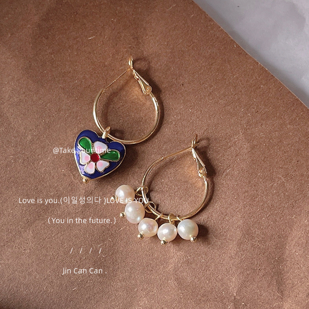 C廠【1242】景泰藍質感高級感宮廷風愛心不對稱耳扣淡水珍珠優雅民族風耳飾女 24.03-4