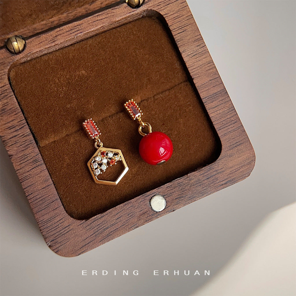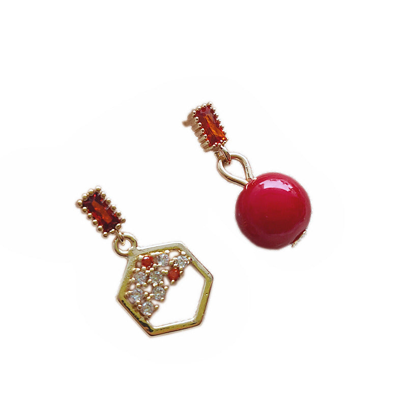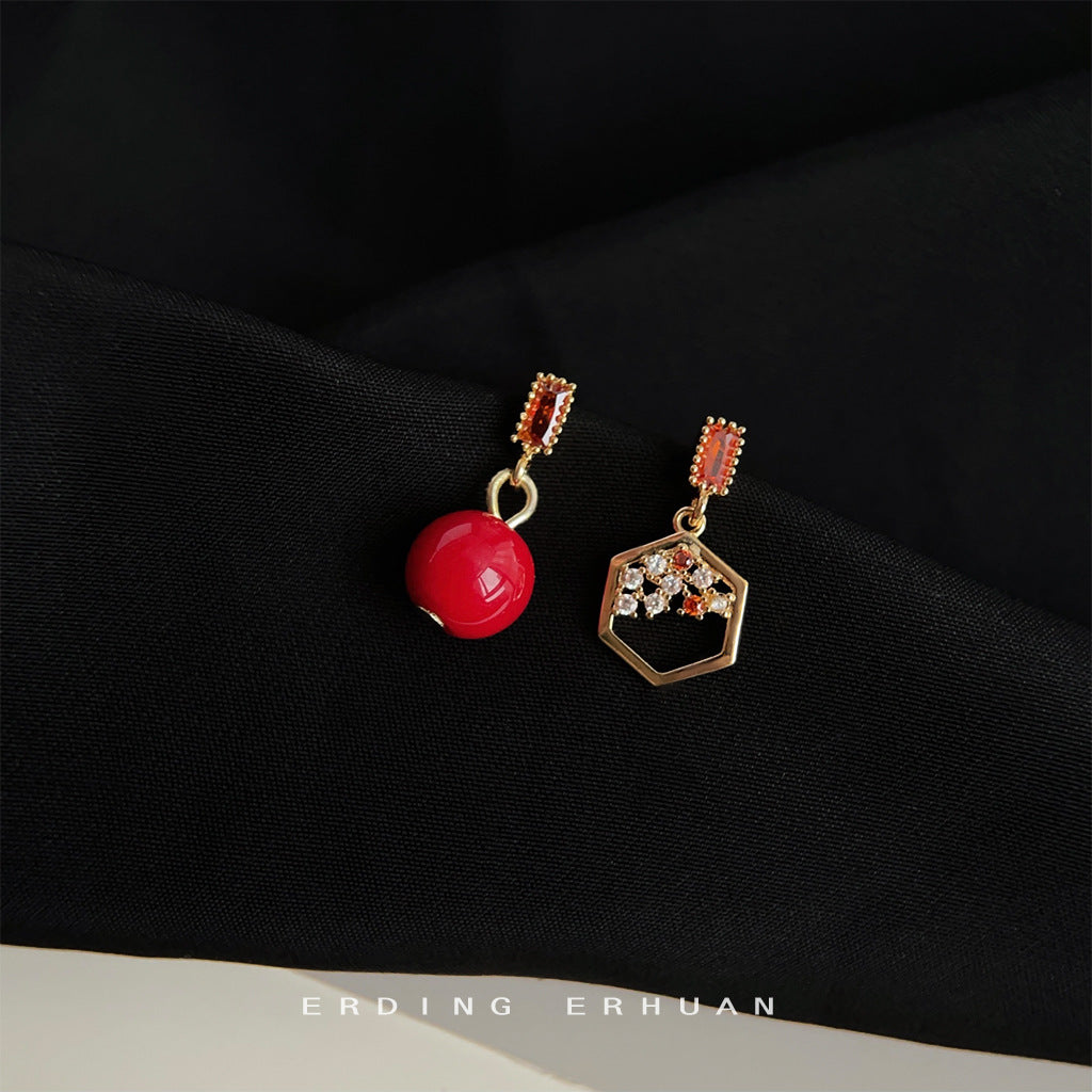 C廠【1259】中國風高級感不對稱紅色珍珠氣質耳環新中式微鑲鋯石鏤空幾何耳飾 24.05-4