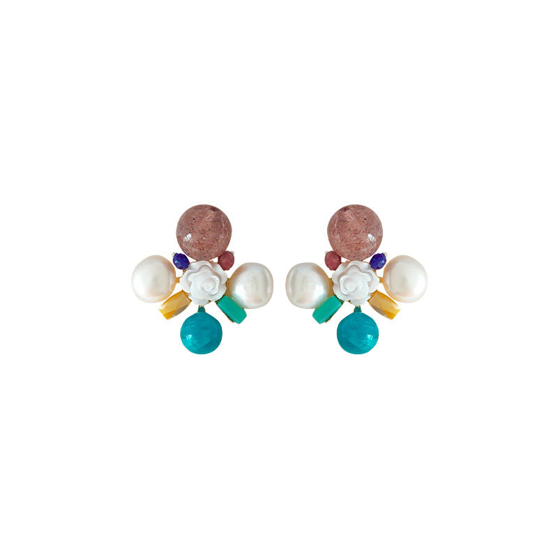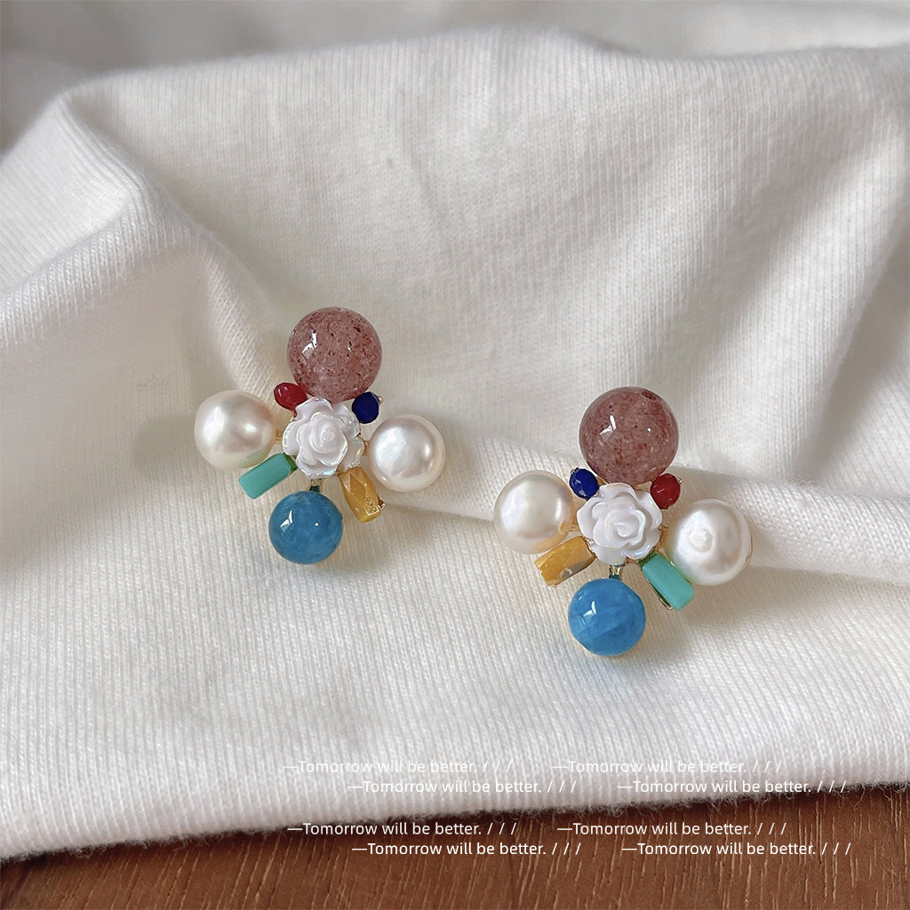 C廠【1396】度假風優雅手工藝淡水珍珠耳環設計感草莓晶立體山茶花復古文藝耳飾 24.04-4