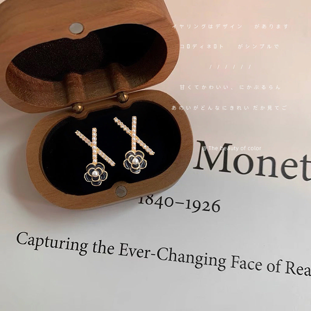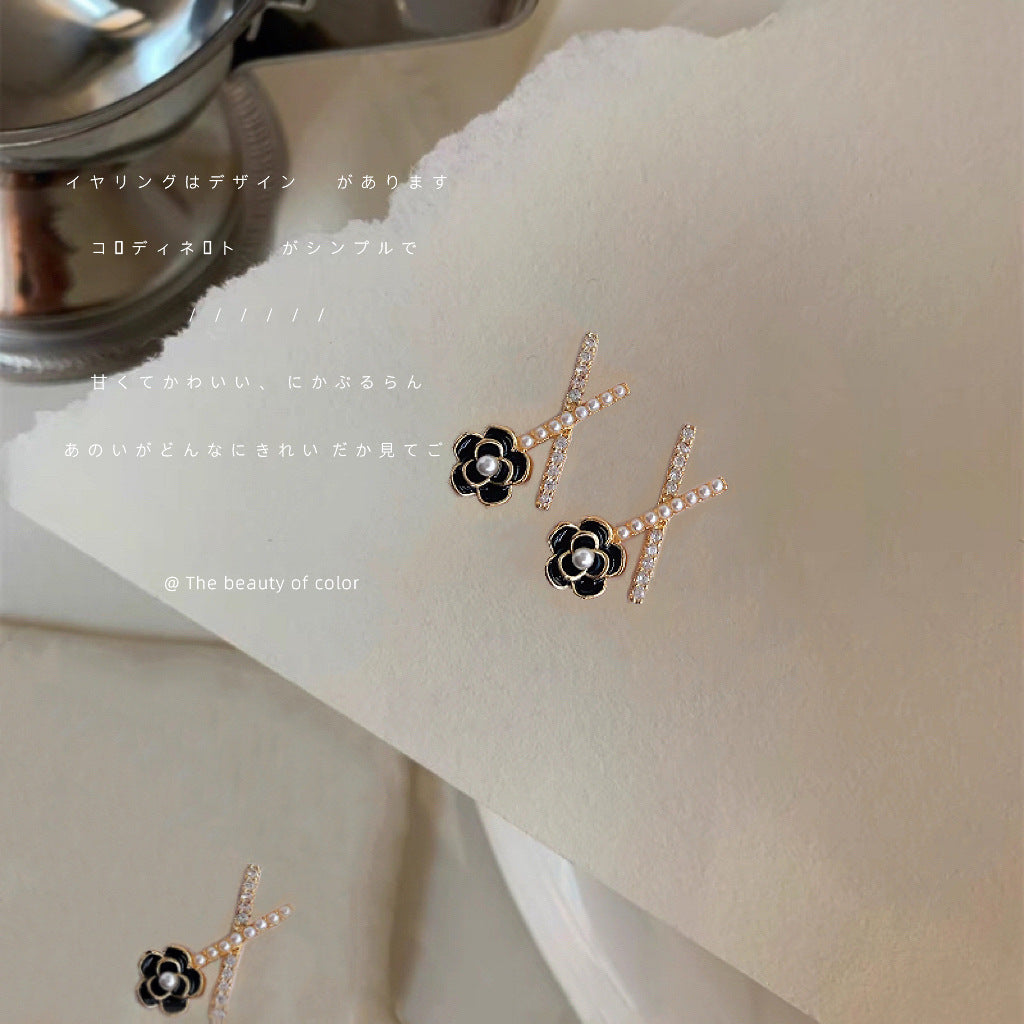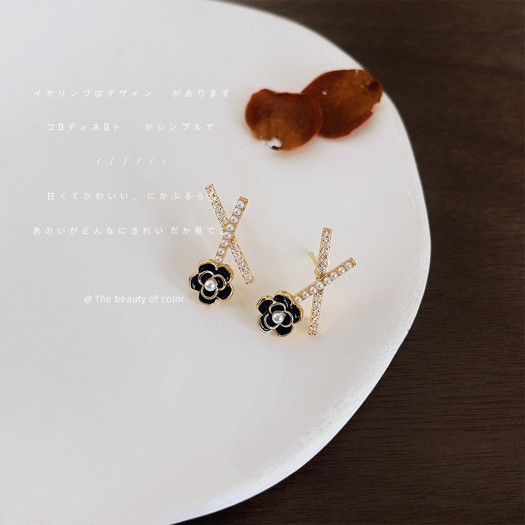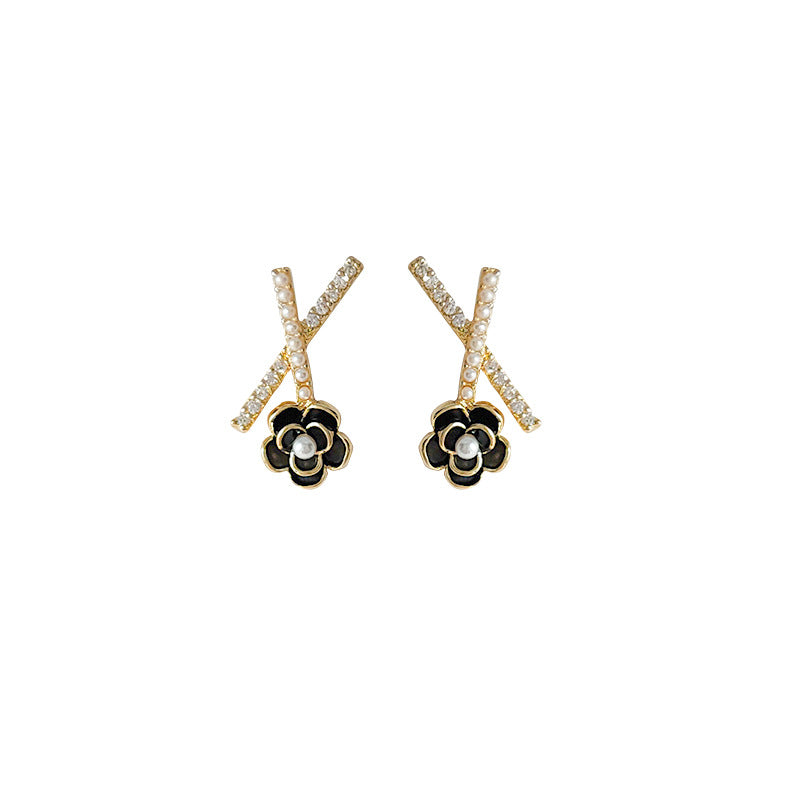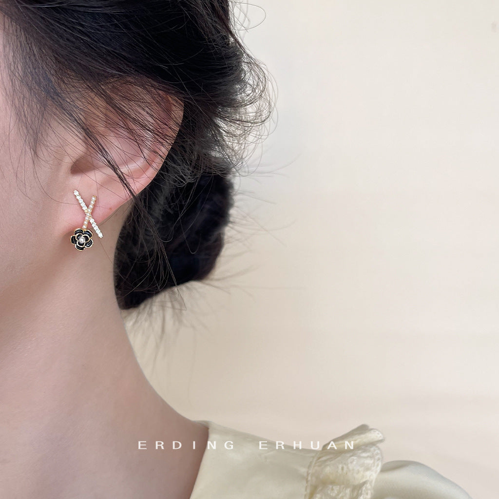 C廠【1432】小香風微鑲鋯石黑金色山茶花耳環設計感交叉大氣高級感氣質耳飾女 24.05-4