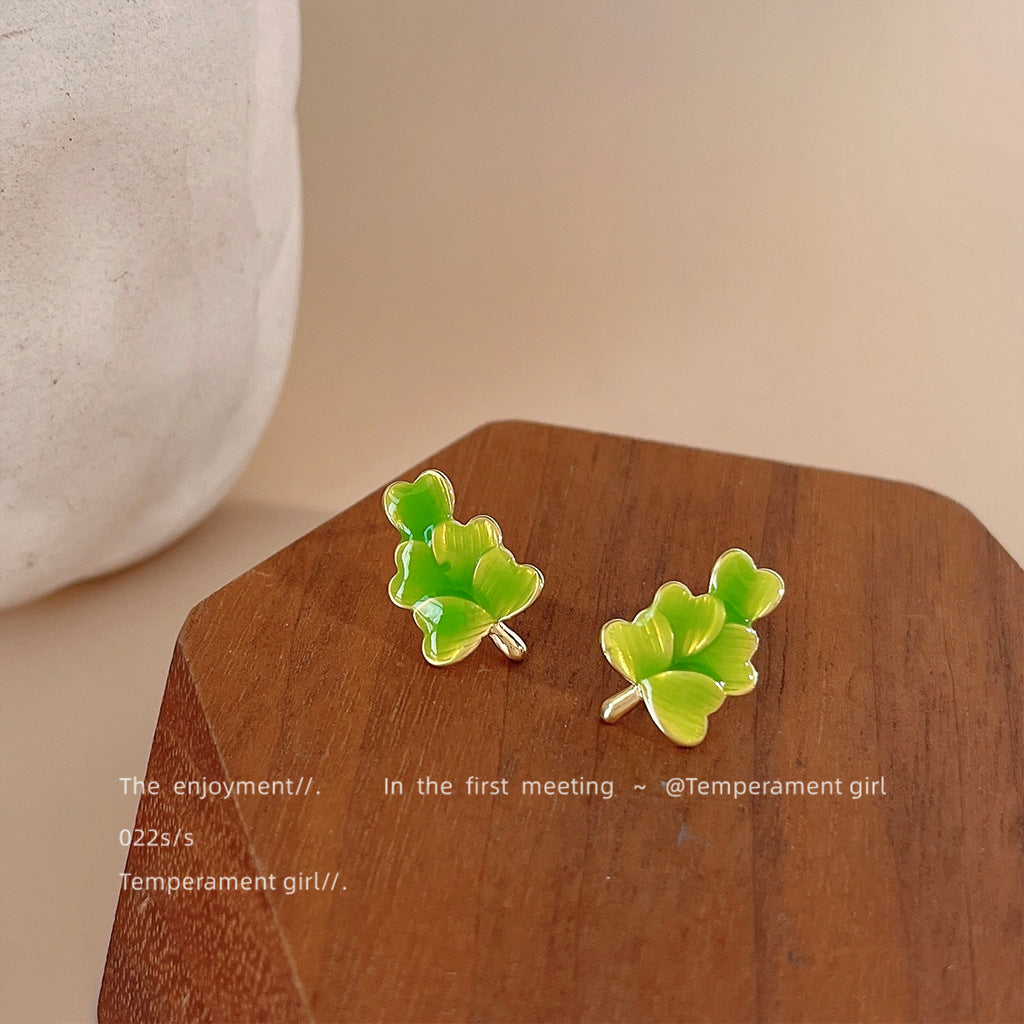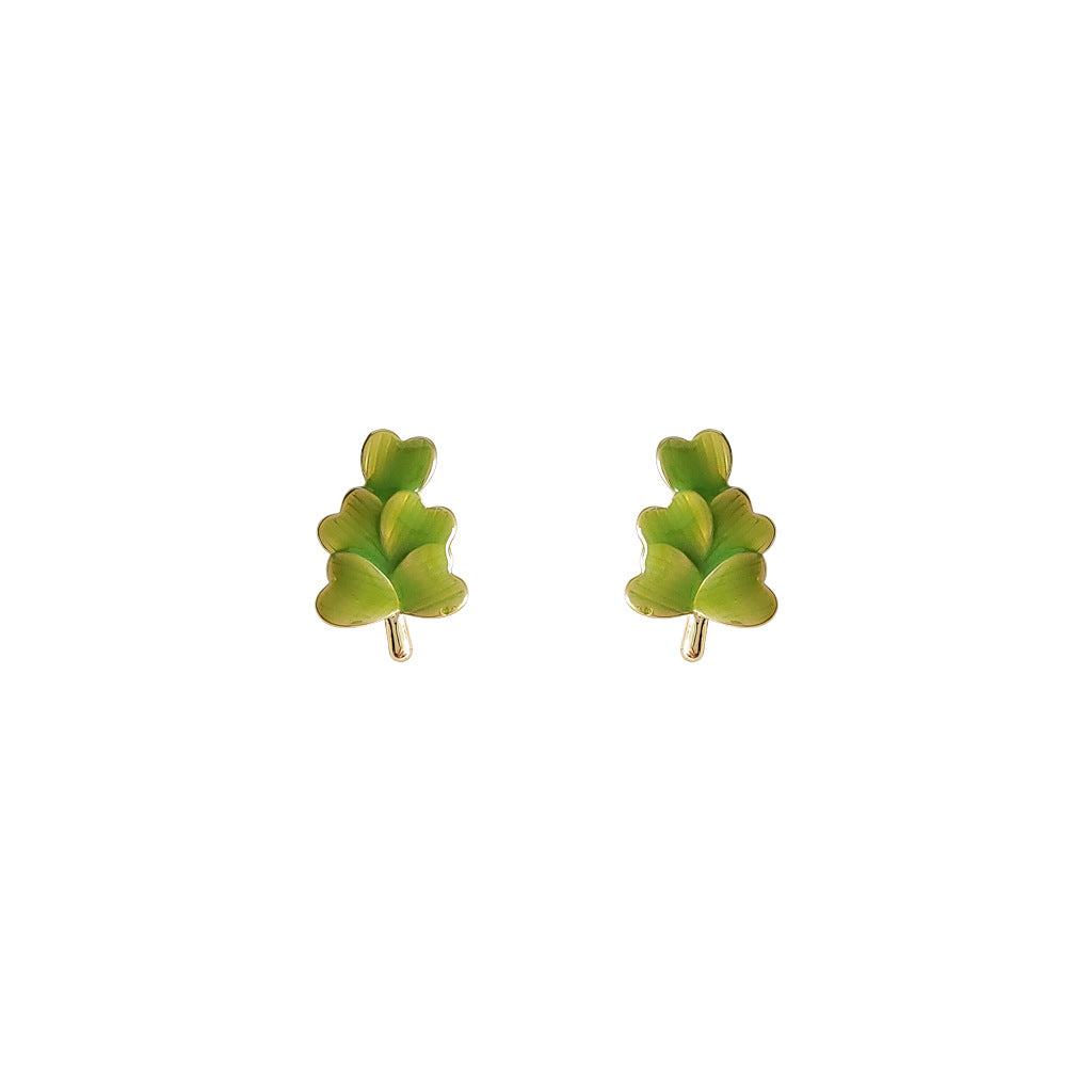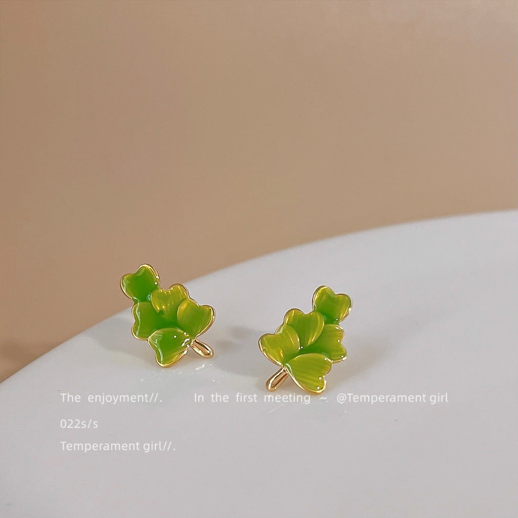 C廠【1779】早春森系清新綠色愛心樹葉滴釉耳環小巧百搭設計感心形幸運草耳飾 24.01-2