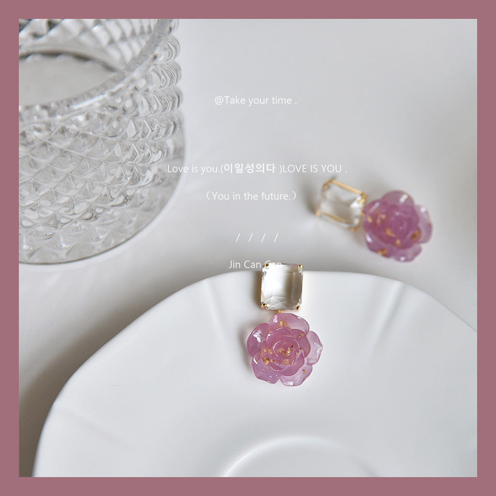 C廠【1942】夢幻紫透明水晶手工玫瑰花朵氣質森系田園風優雅花朵耳飾 24.03-2