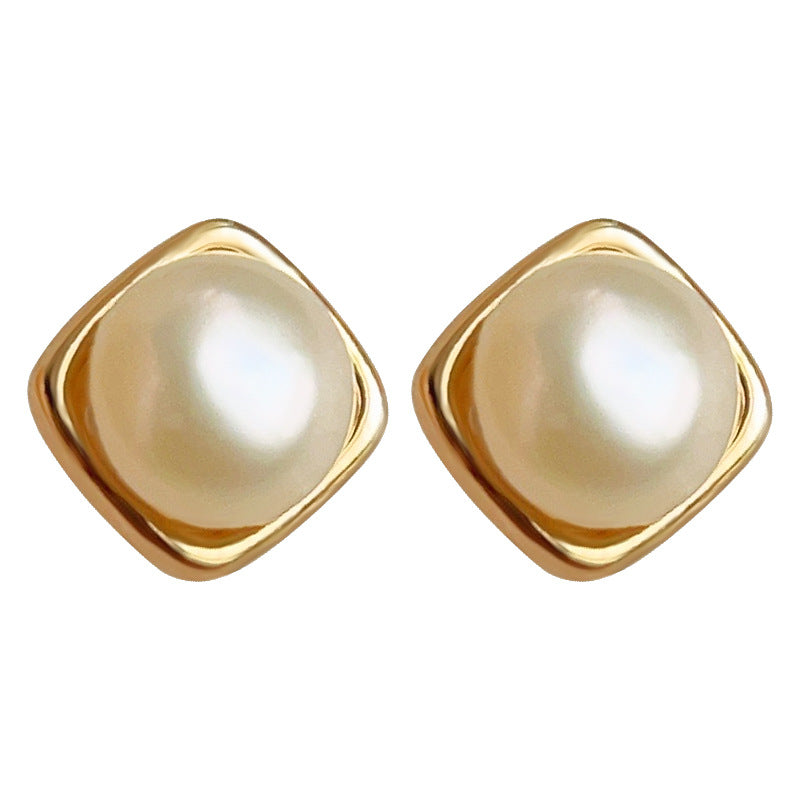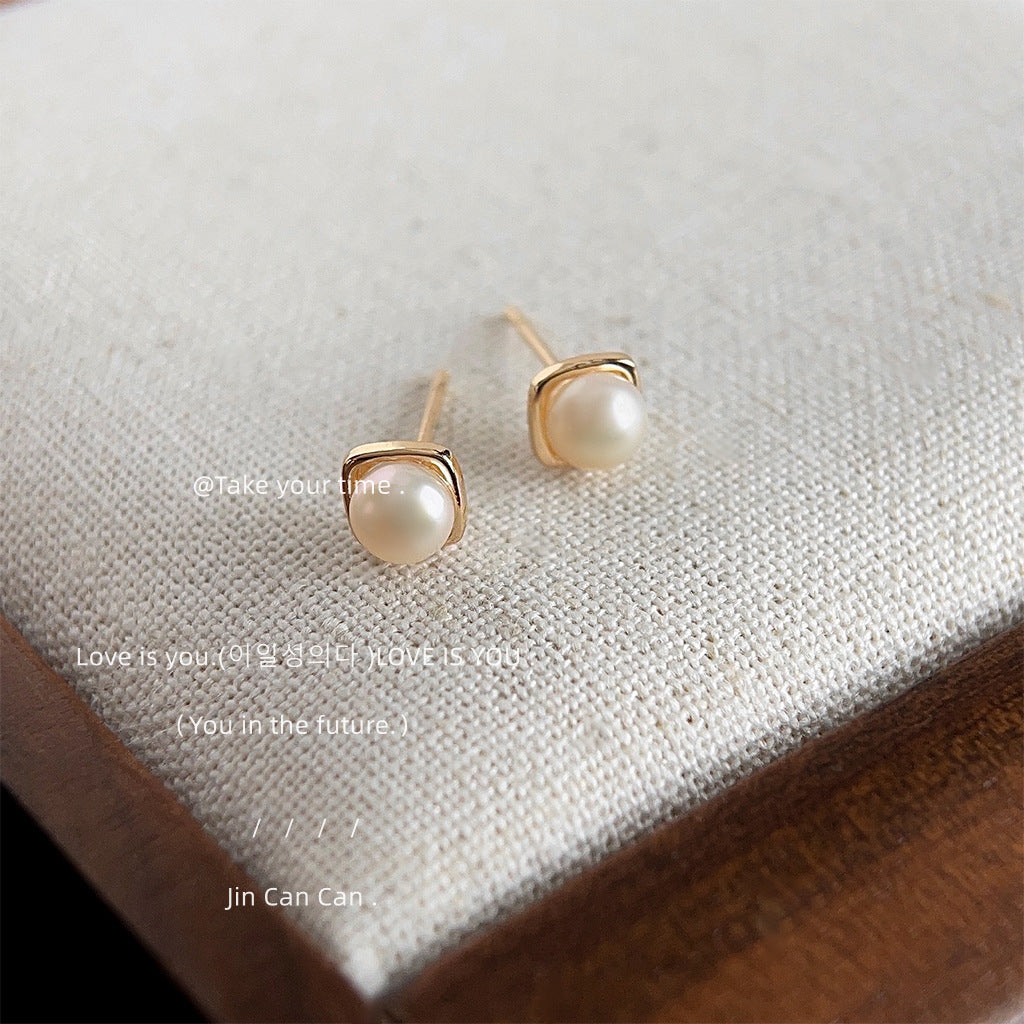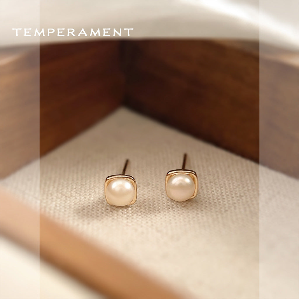 C廠【3607】淡水珍珠通勤百搭簡約輕奢鍍14K迷你版方形幾何銀針耳環 24.01-3