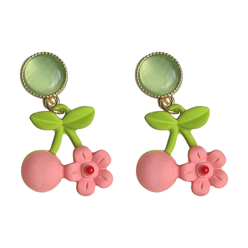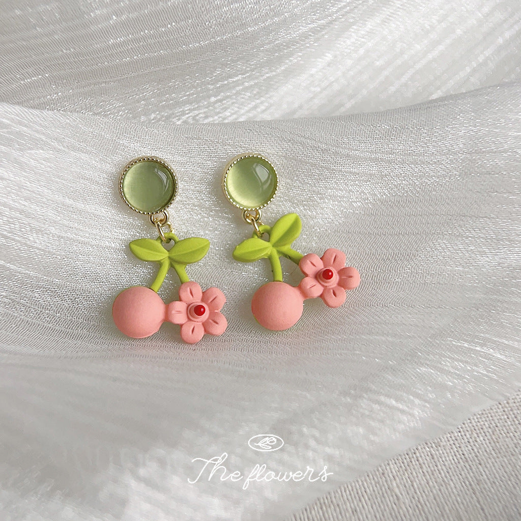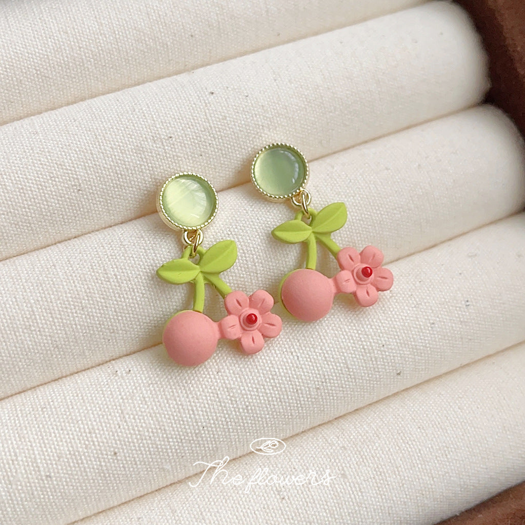 C廠【3650】森系小清新可愛甜美烤漆玻璃貓眼石花朵櫻桃氣質優雅耳飾 24.03-2