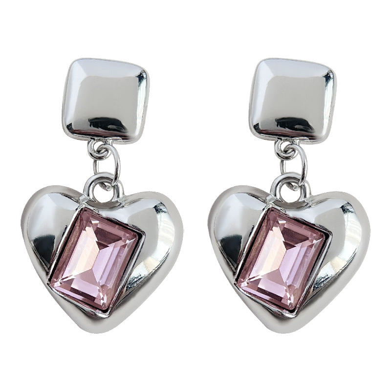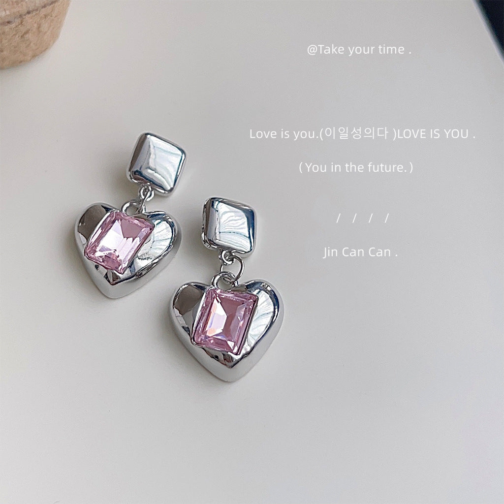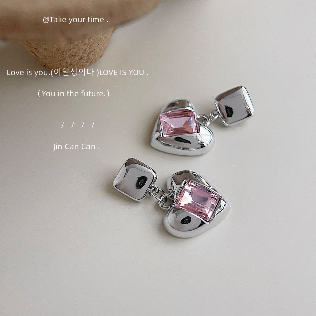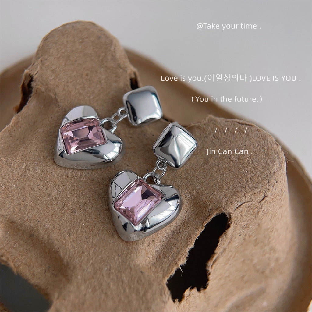 C廠【3682】個性甜酷風玻璃水晶粉紅心型銀針耳飾ins少女心新款耳環飾品 24.03-2