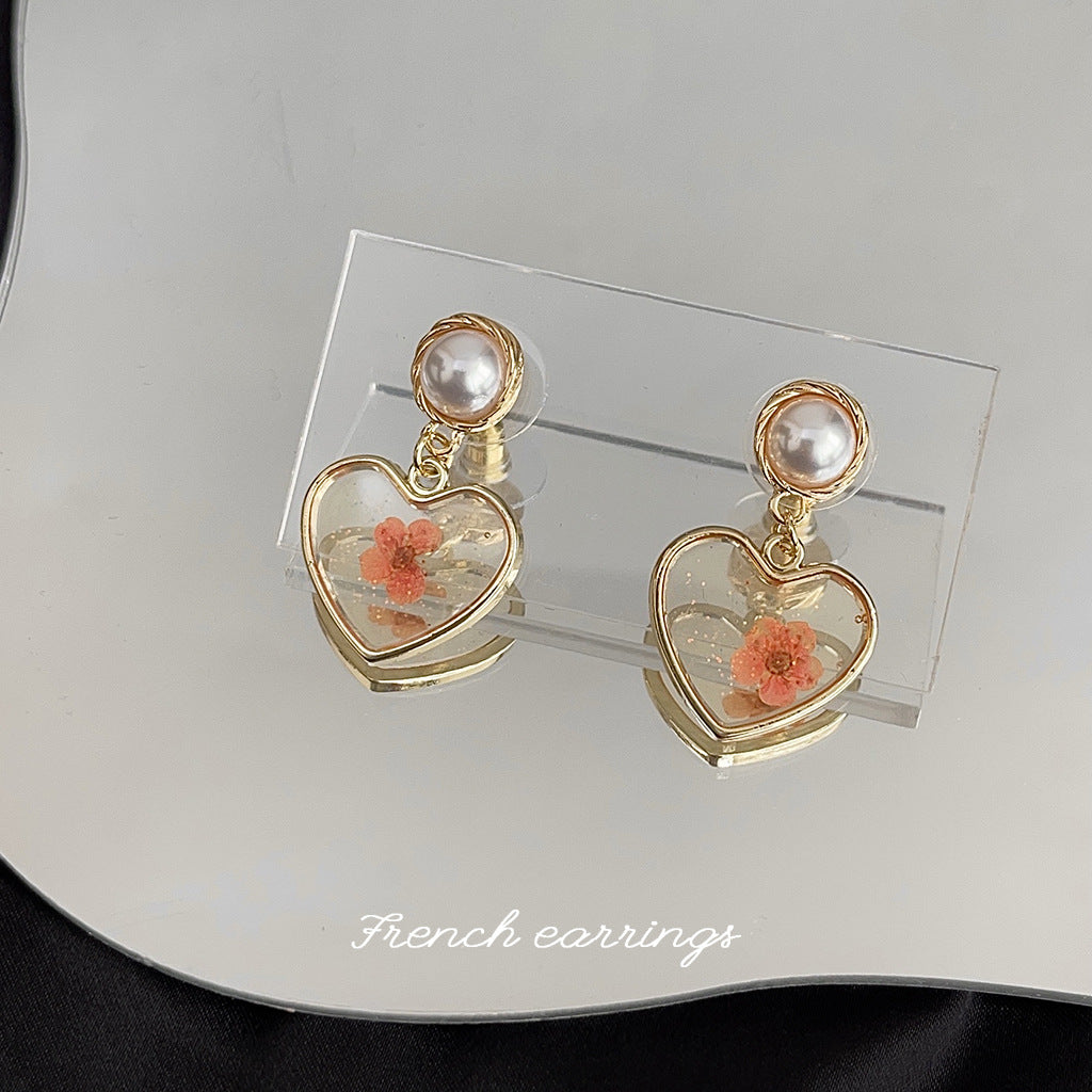 C廠【3697】森系小清新真乾花滴油透明質感心形手工甜美耳飾鍍14K耳環女 24.04-1