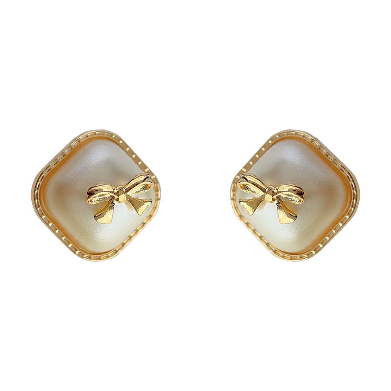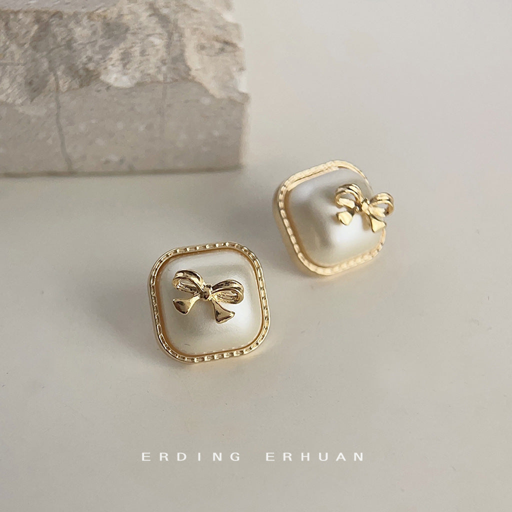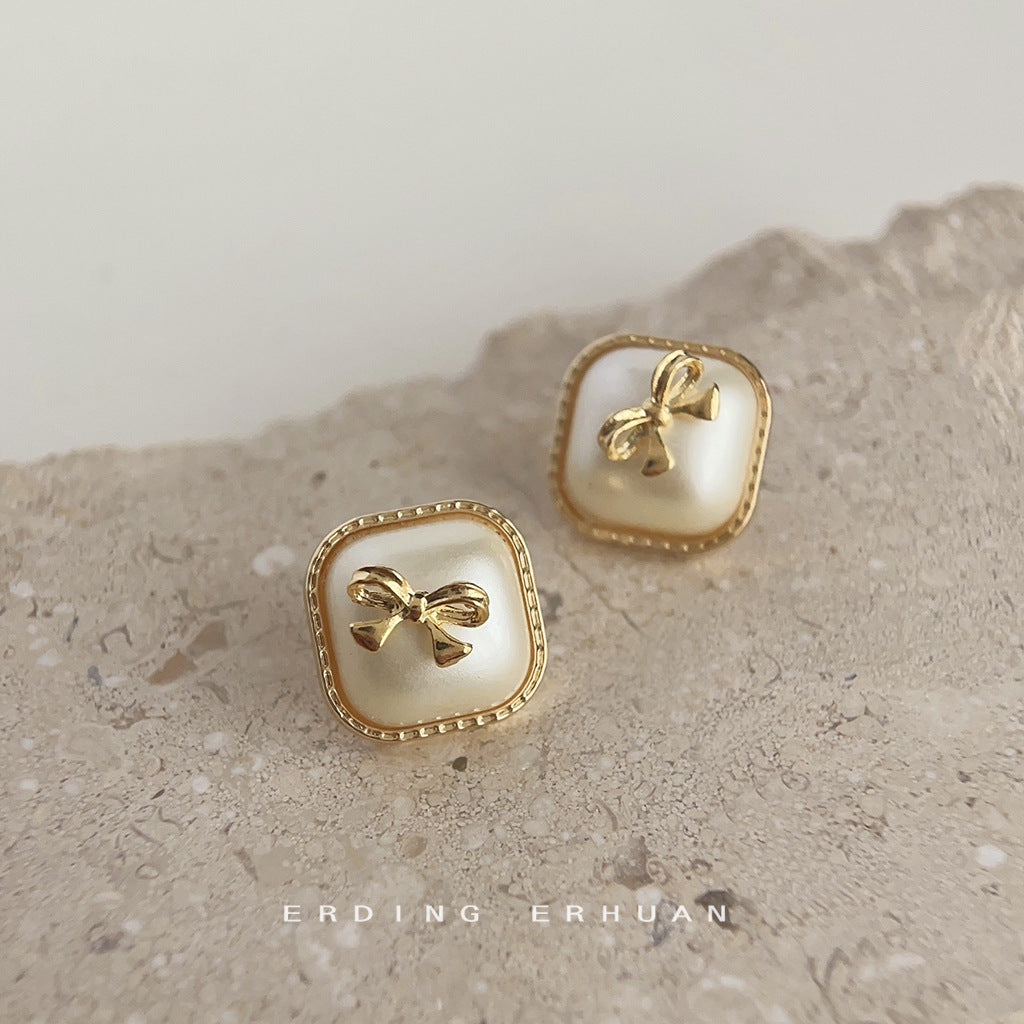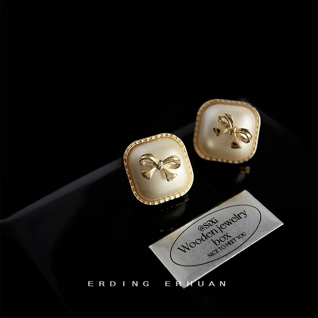C廠【3863】小香風高級感方形幾何珍珠蝴蝶結鍍14K耳環氣質優雅通勤時尚耳環 24.04-2