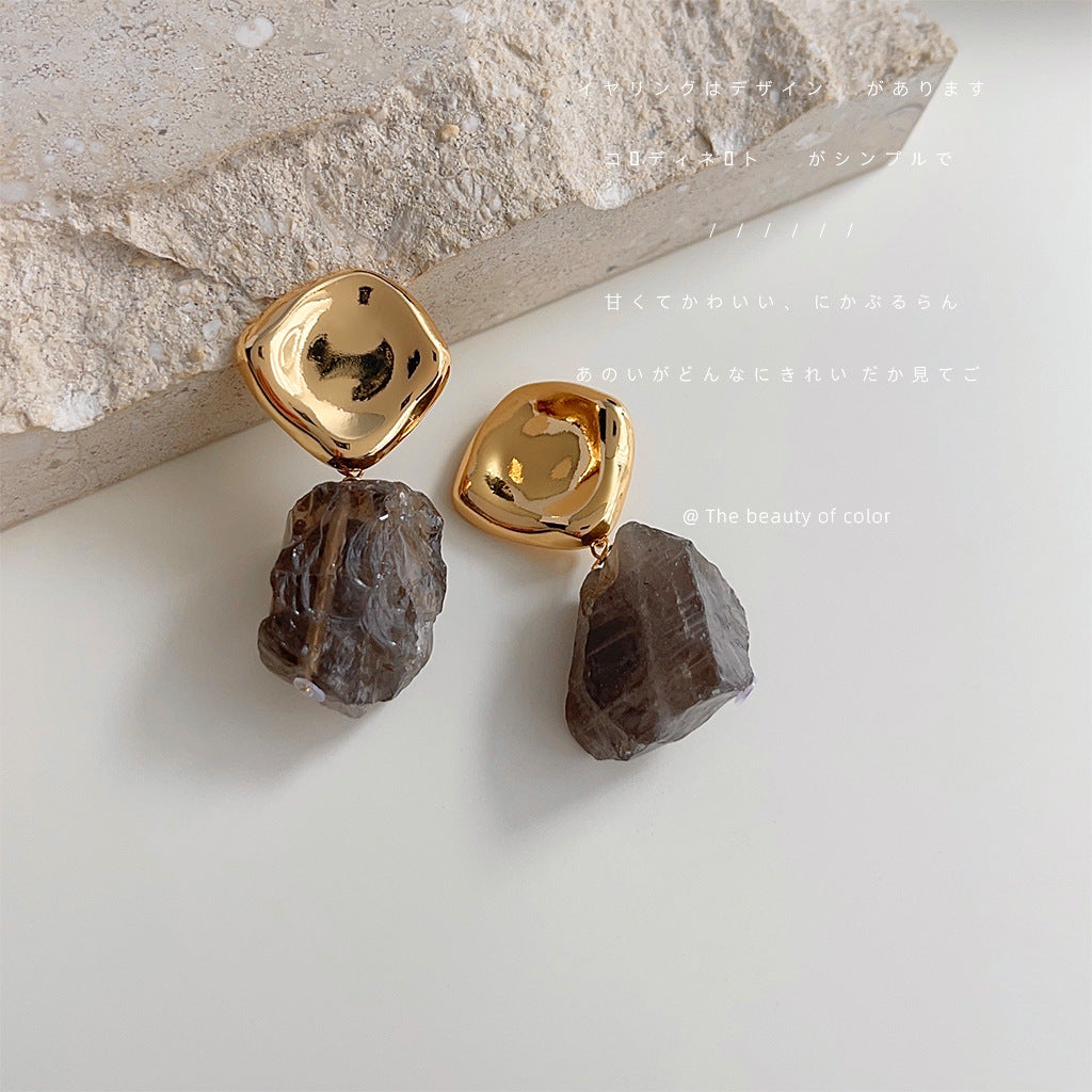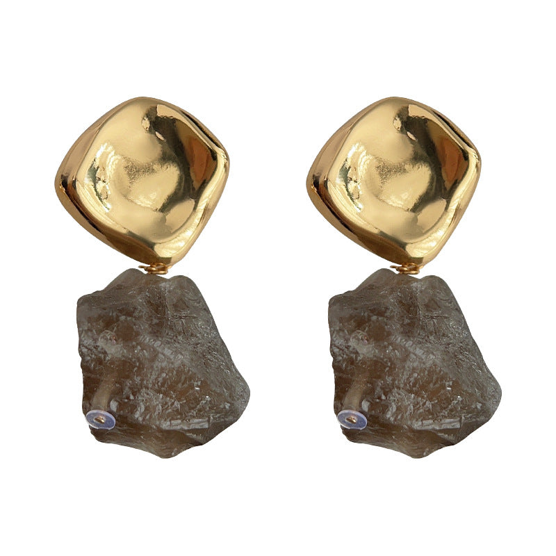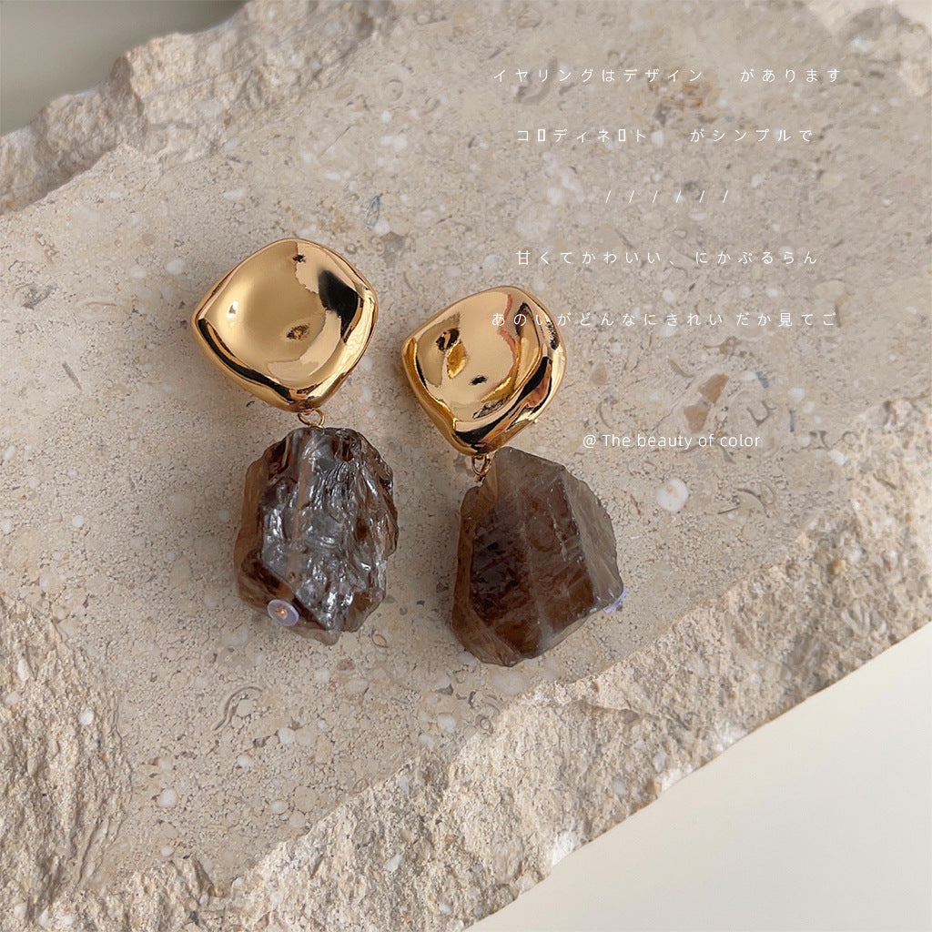 C廠【3938】天然碎石水晶咖色手工藝設計鍍14K新款耳環工廠不規則耳環飾品 24.09-3