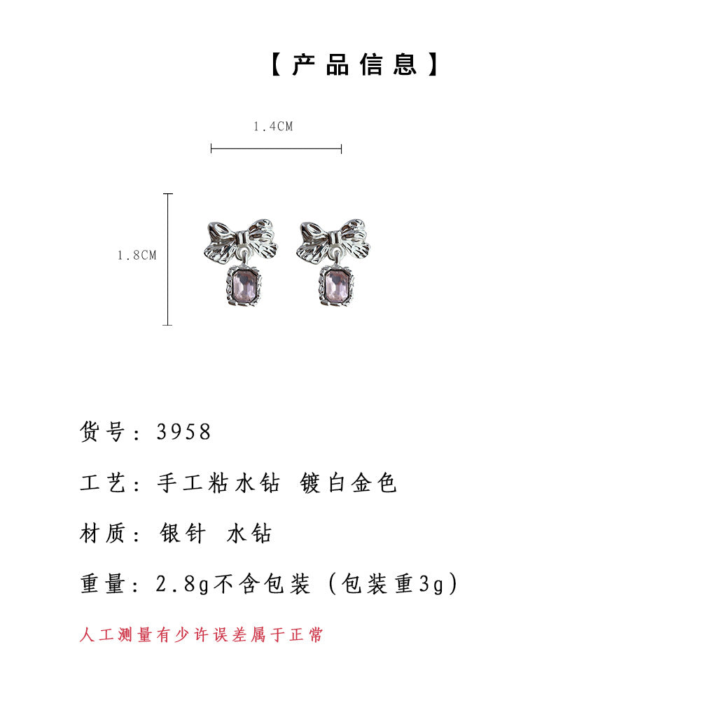 C廠【3958】粉紅色玻璃水晶甜美小清新蝴蝶結銀針耳飾氣質簡約通勤個性ins耳環 24.05-1