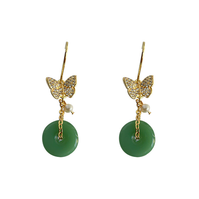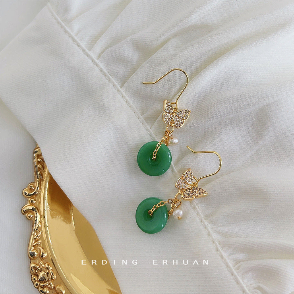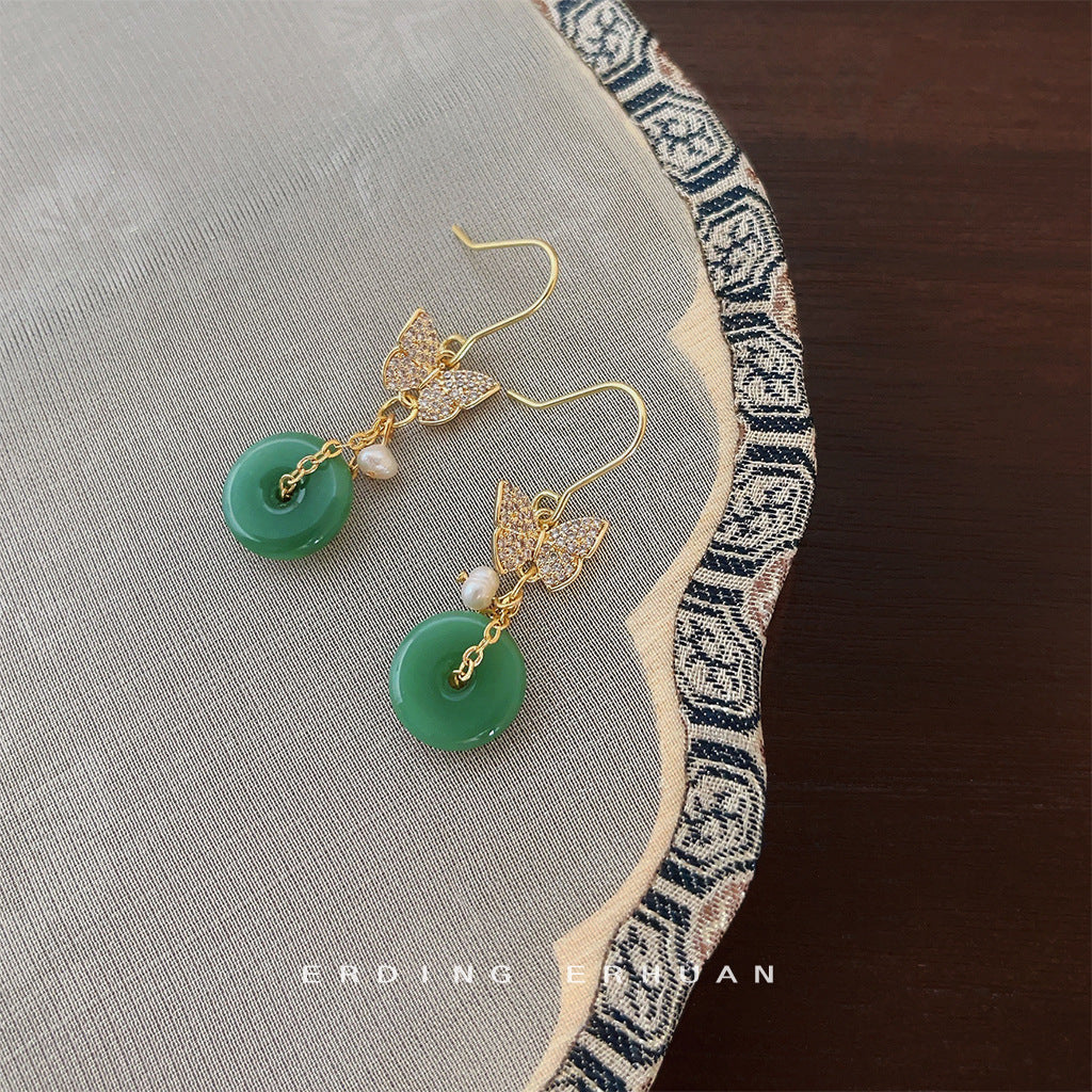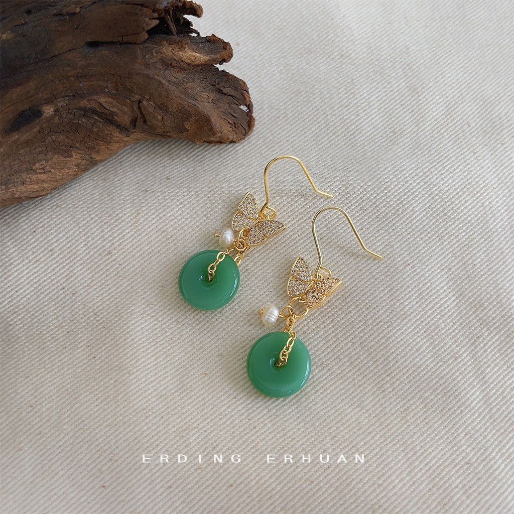 C廠【4146】全新中式微鑲鋯石蝴蝶平安扣玉色珍珠耳環飾品個性風潮新款耳環 24.06-1