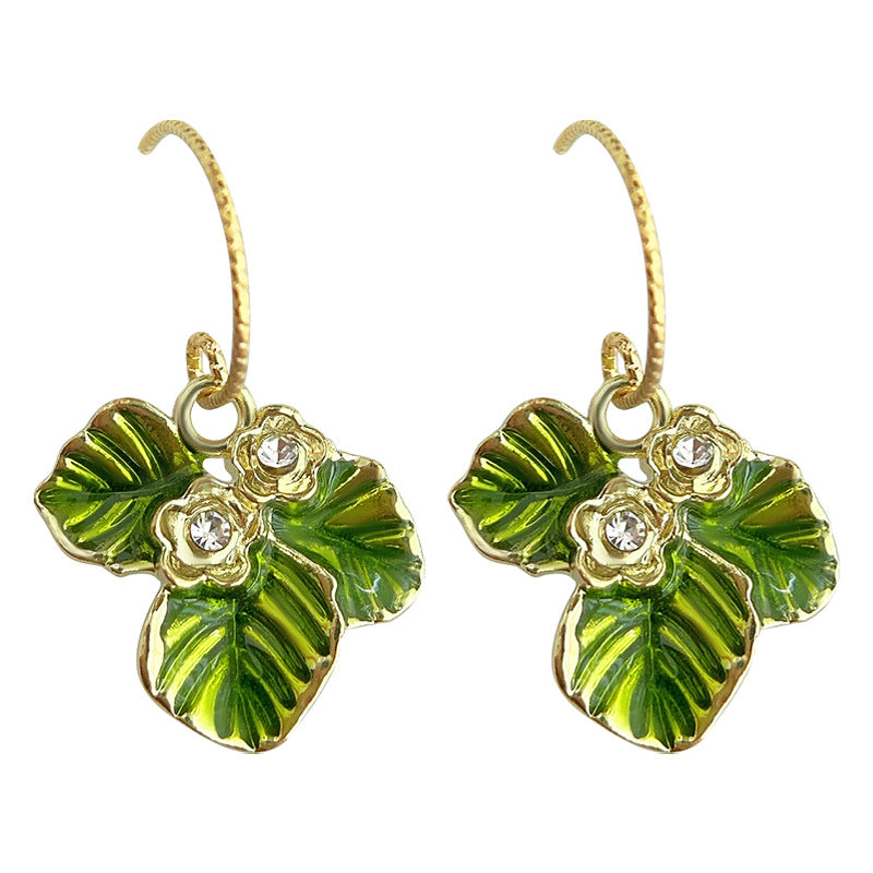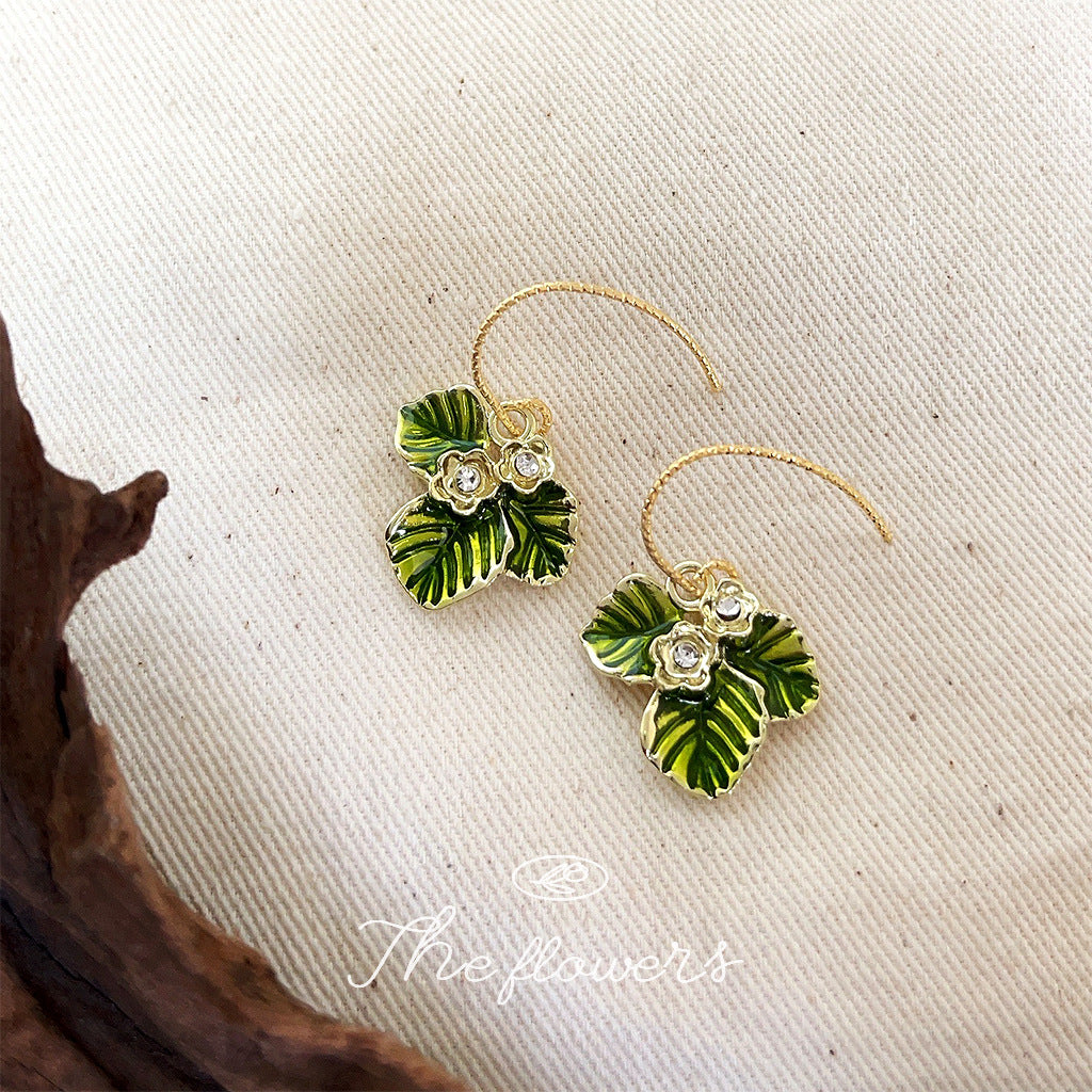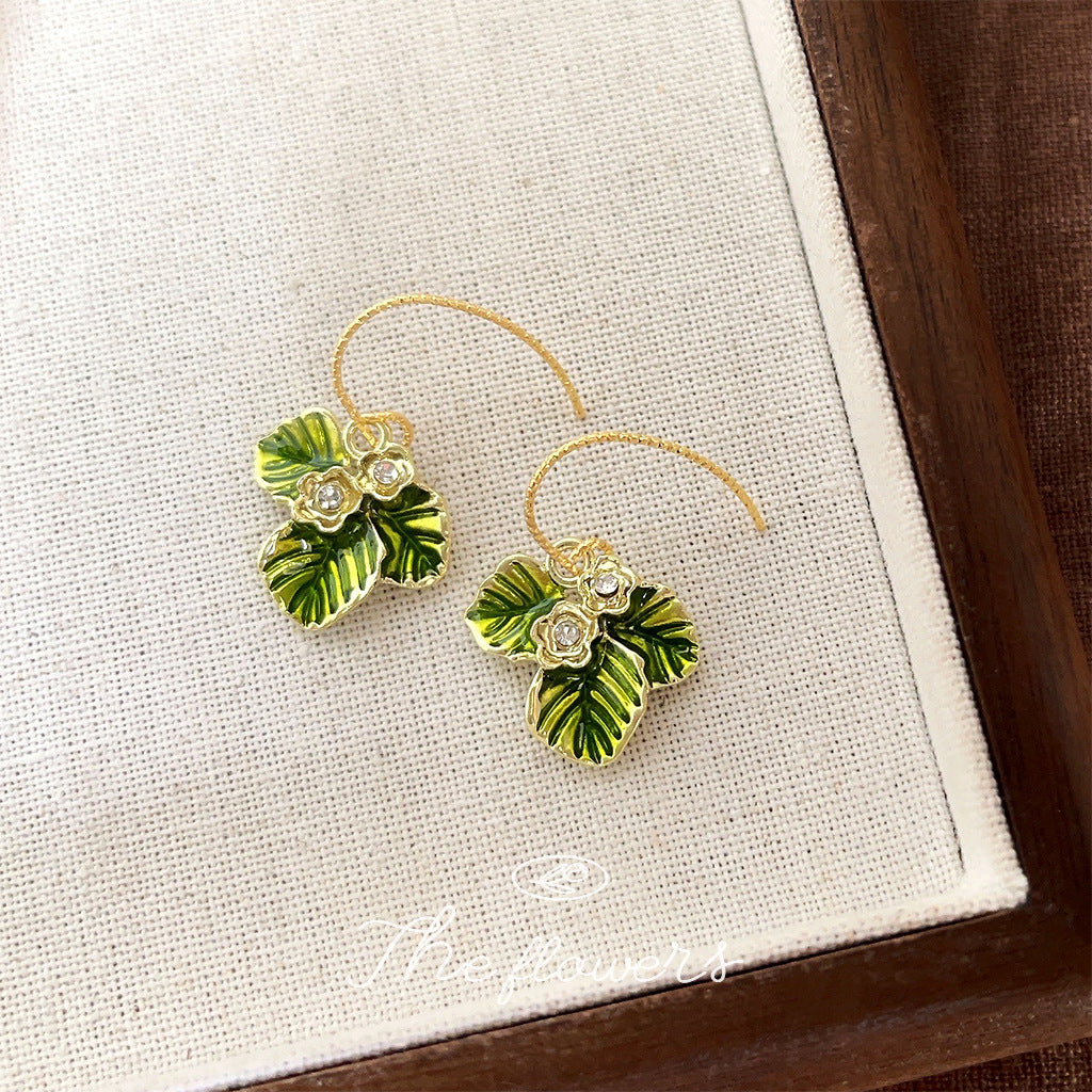 C廠【4176】法式復古琺瑯滴釉綠色葡萄葉耳環優雅文藝綠色樹葉高級感氣質耳飾 24.09-1