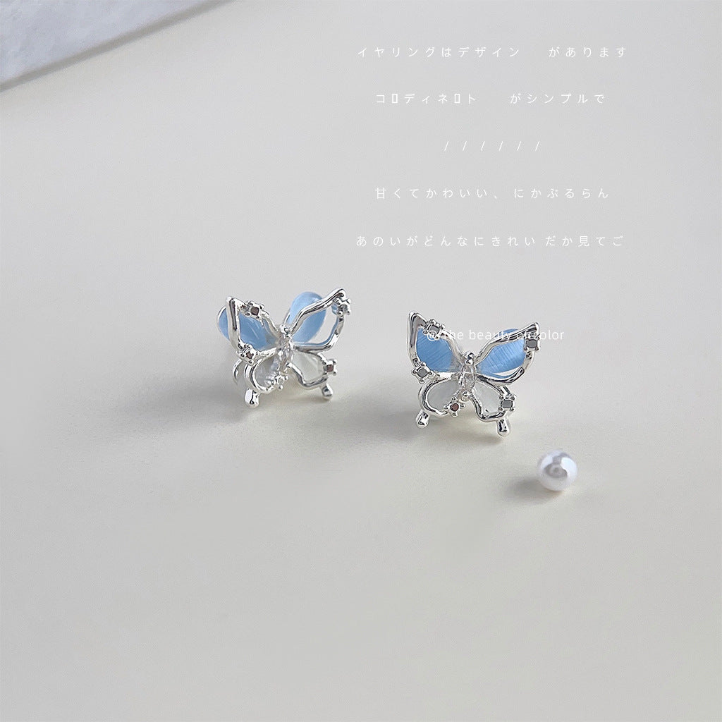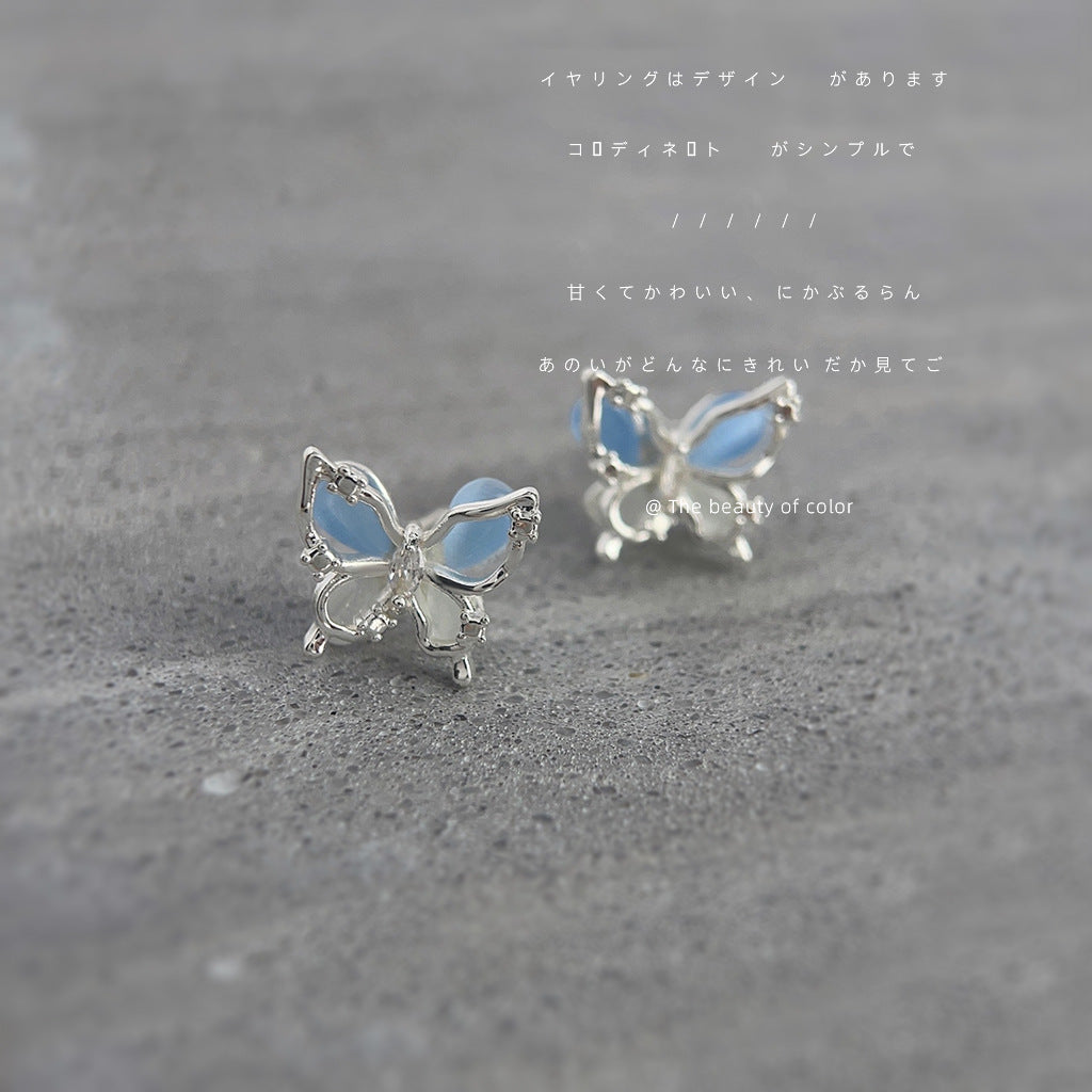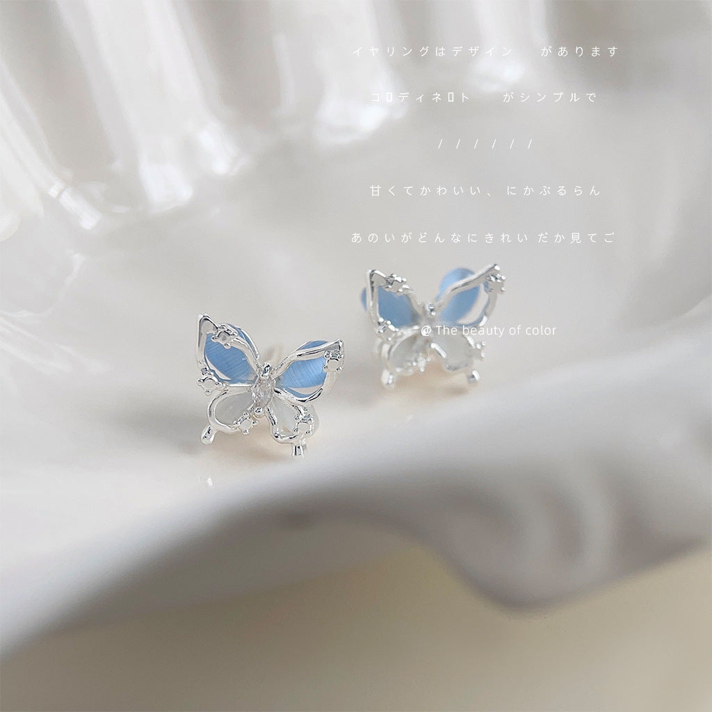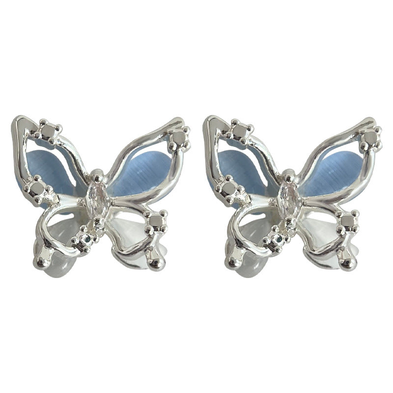 C廠【4226】夏日新款微鑲鋯石藍色玻璃貓眼石立體蝴蝶耳環2024個性甜酷風耳飾 24.06-2