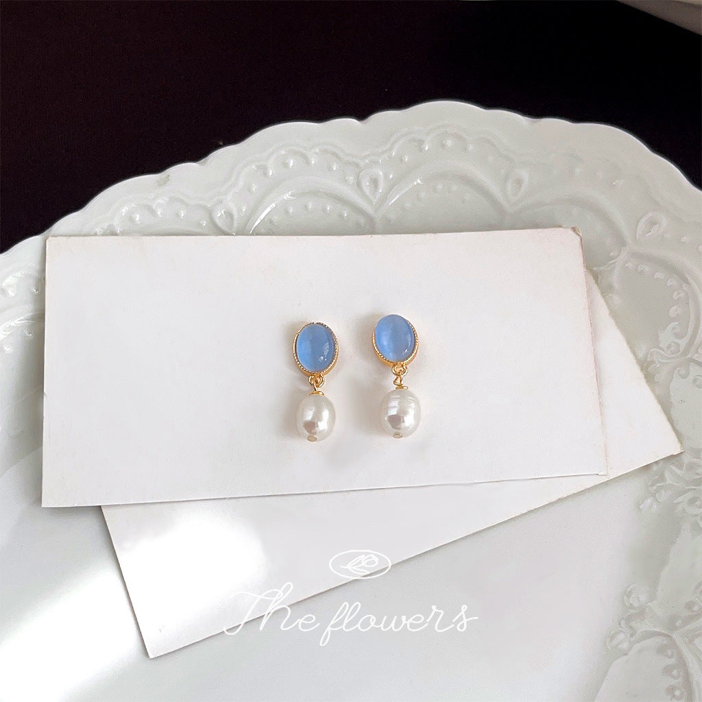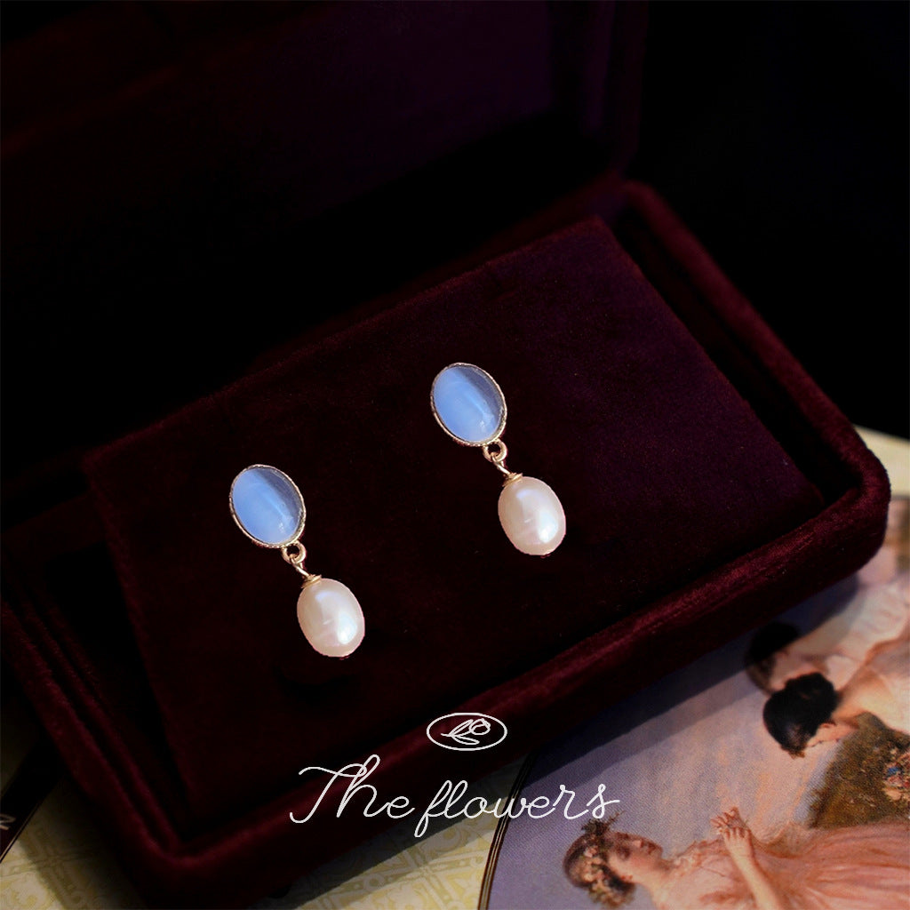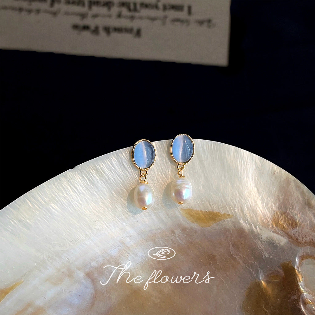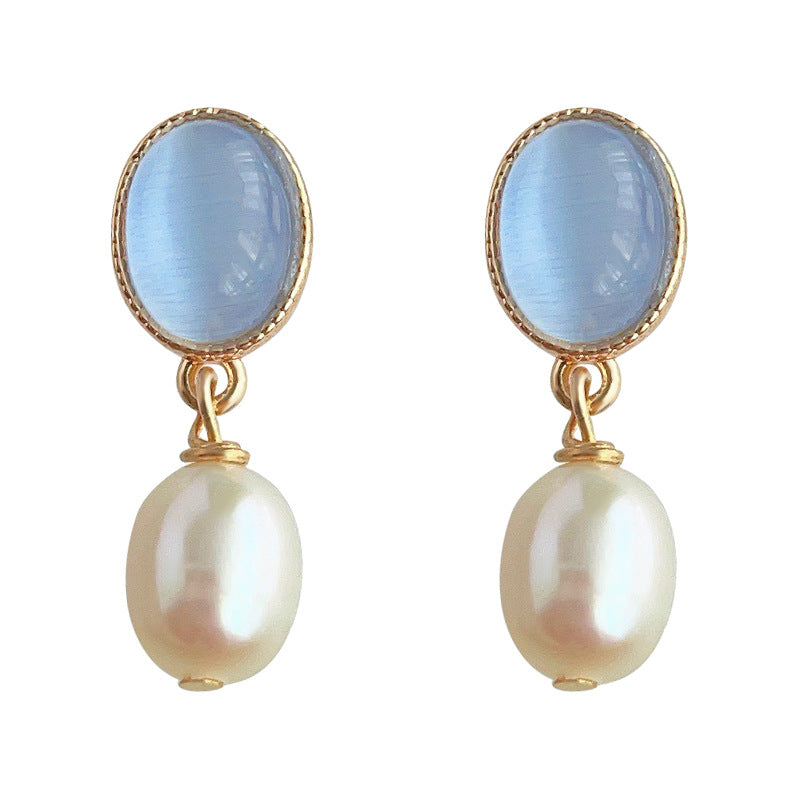 C廠【4290】淡水珍珠法式復古玻璃貓眼石手工設計小巧簡約通勤鍍14K耳環 24.06-2
