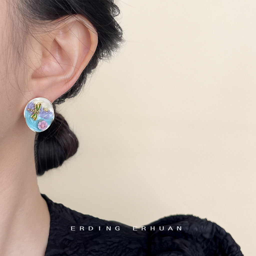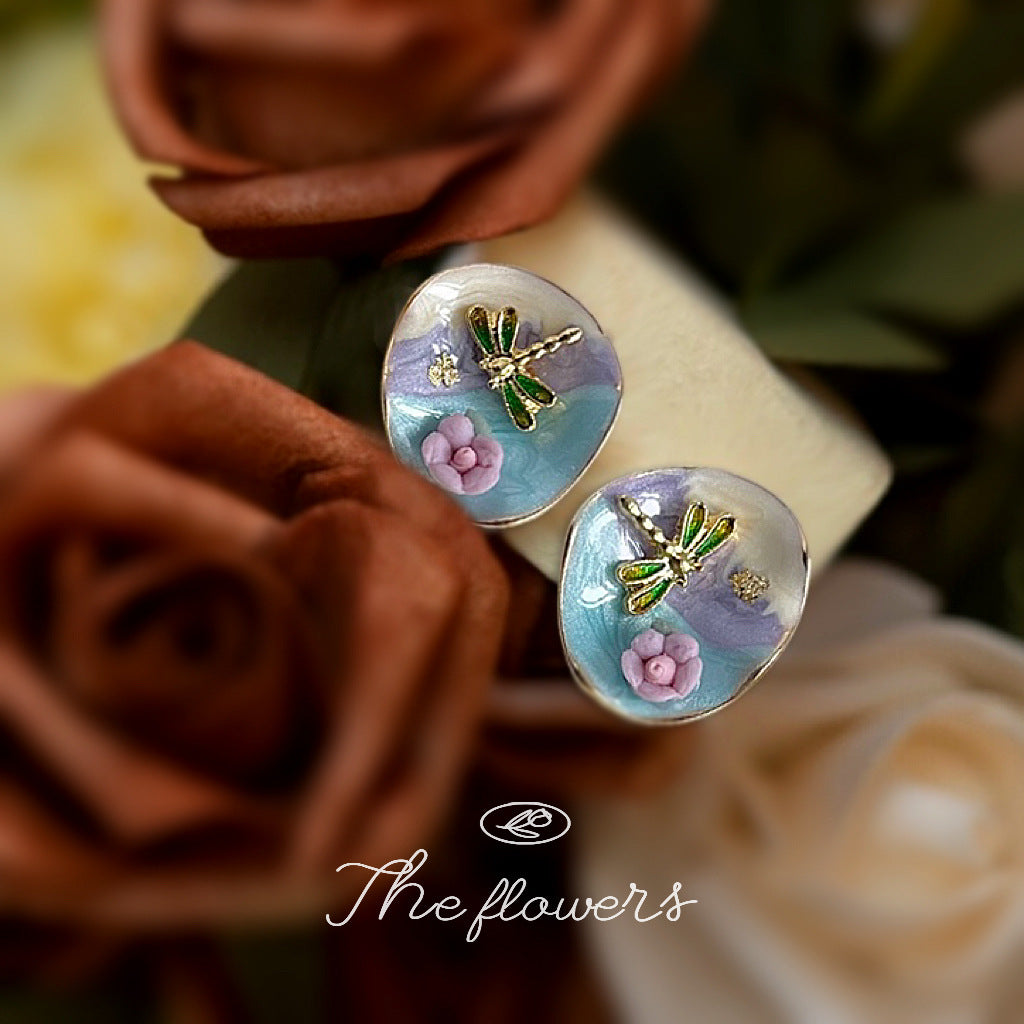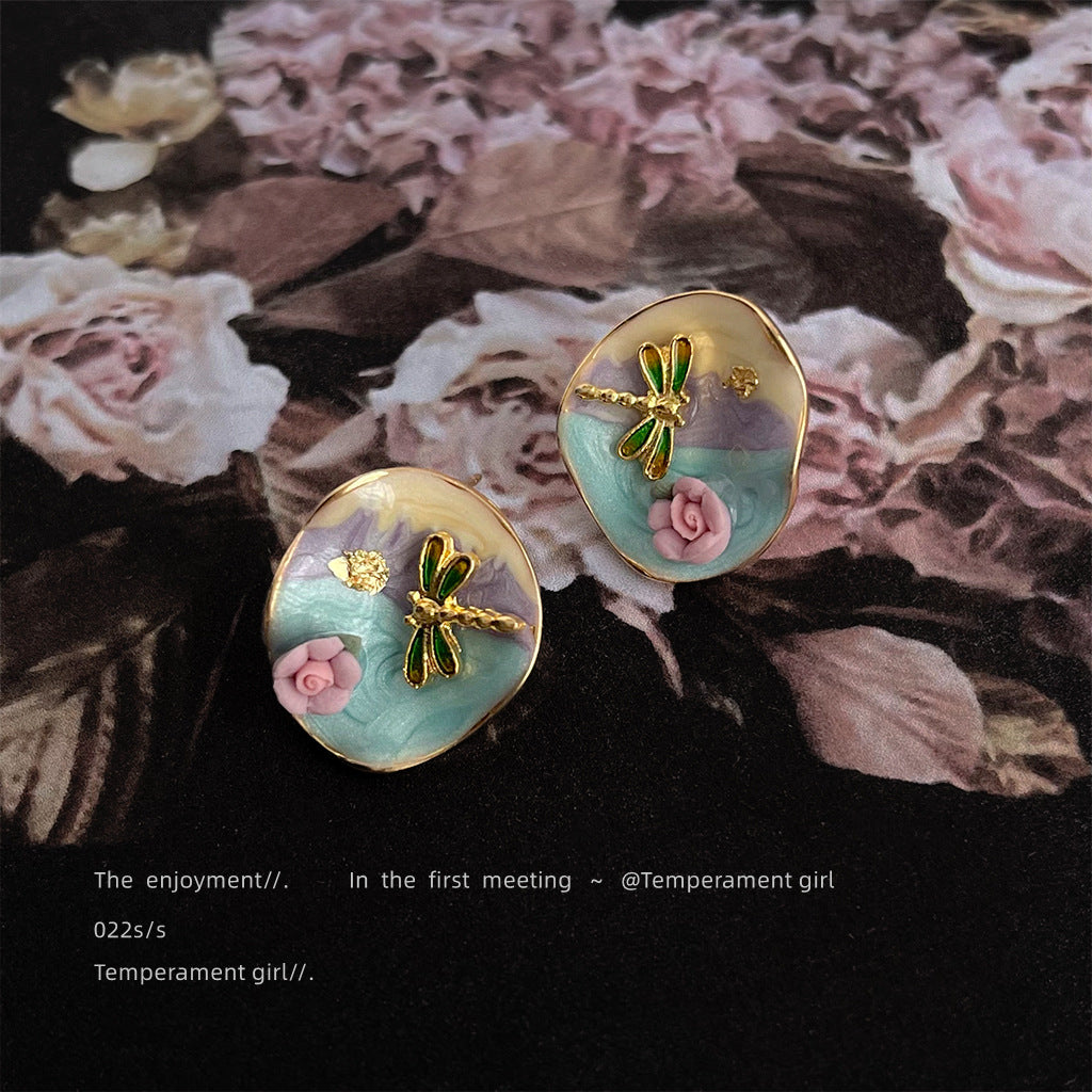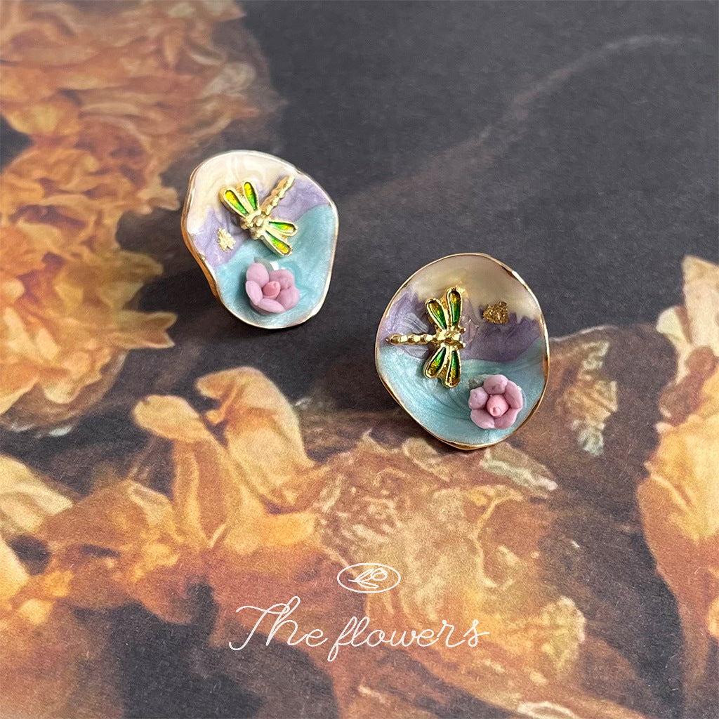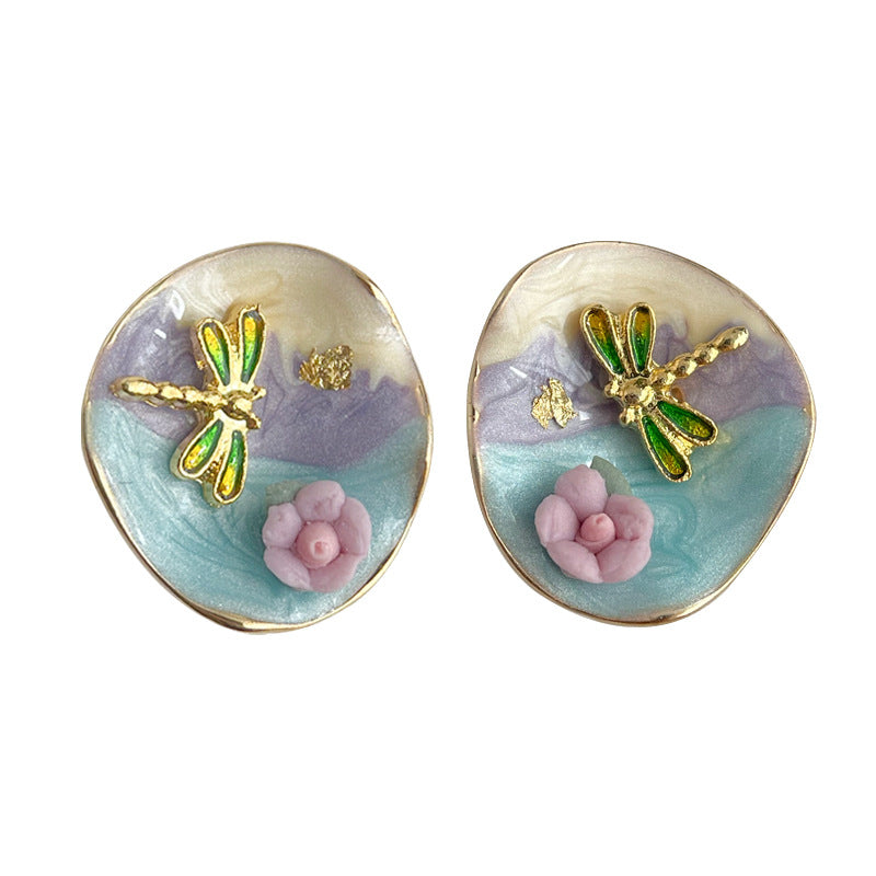 C廠【4427】美人甜美油畫質感琺瑯滴釉質感漸變色蜻蜓鍍14K耳飾耳環耳環 24.06-4