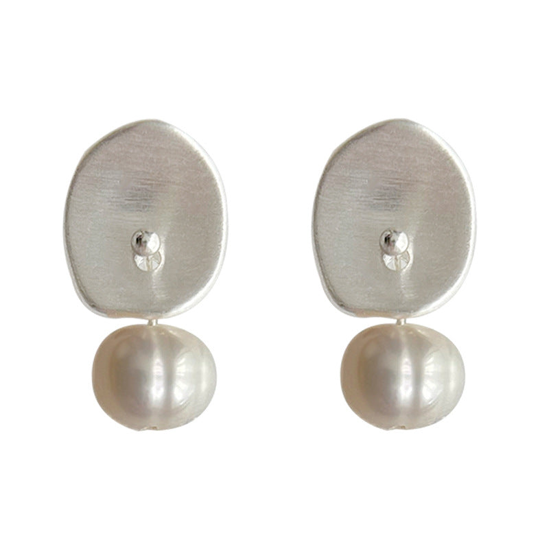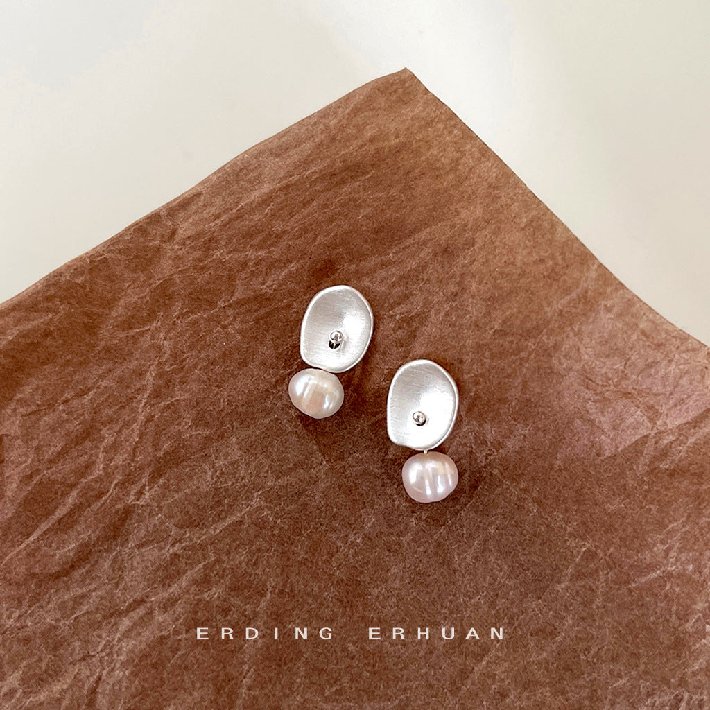 C廠【4496】淡水珍珠霧面銀色拉絲藝術生文藝氣息簡約通勤耳環耳環女飾品 24.08-2