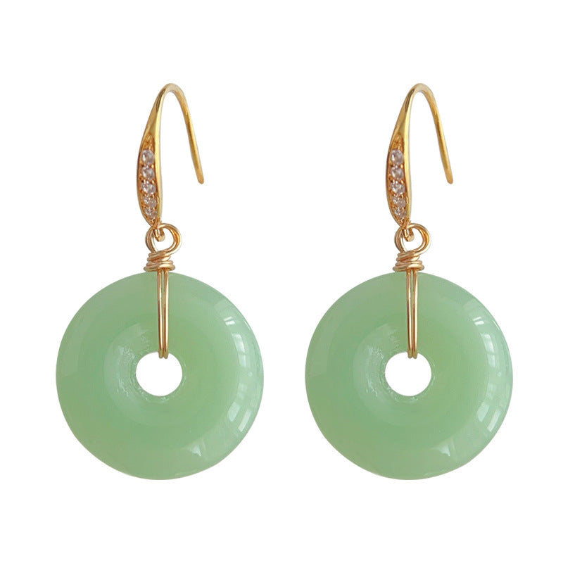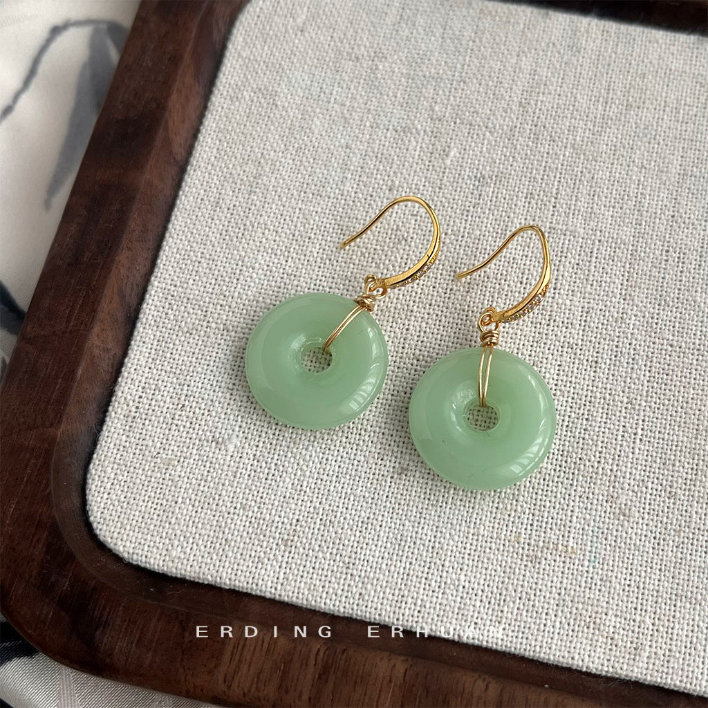 C廠【4516】新中式微鑲鋯石平安扣圓形幾何玻璃玉色耳環手工設計感國潮耳環女 24.08-1