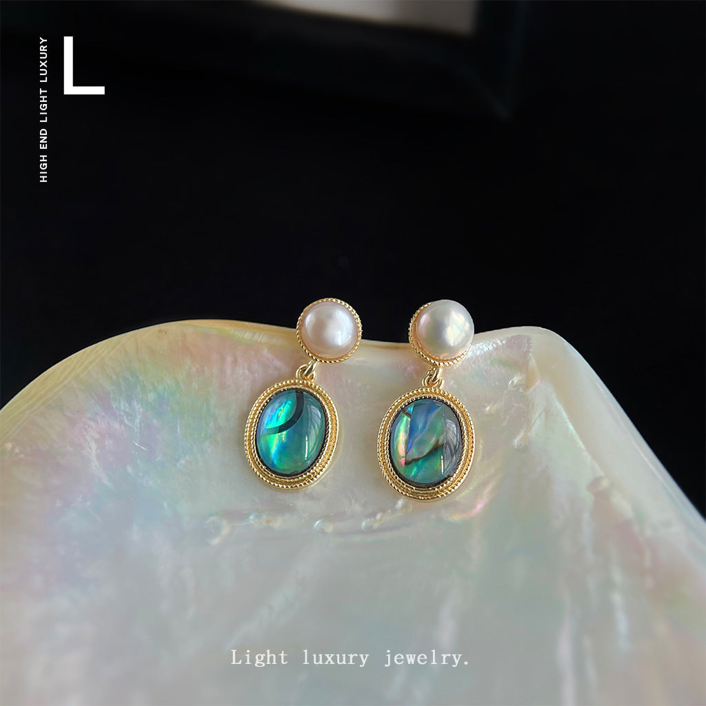 C廠【4695】淡水珍珠法式復古真貝殼鮑魚貝橢圓幾何鍍14K新款耳環耳環女 24.08-4