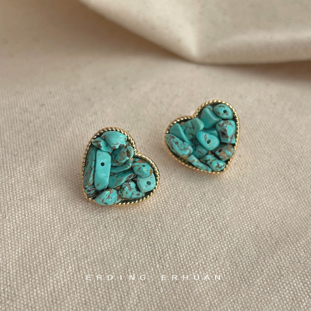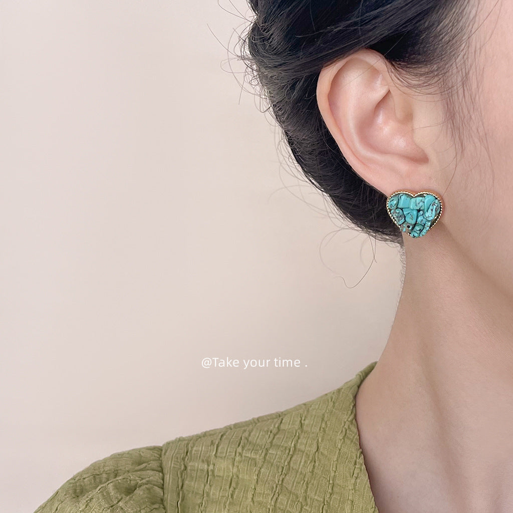 C廠【4705】歐美跨境法式復古鍍14K合成綠松石愛心耳環 氣質簡約個性耳飾 24.08-3