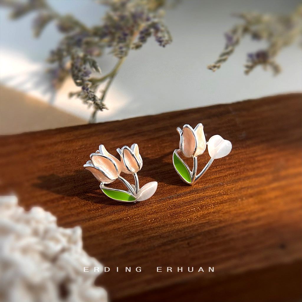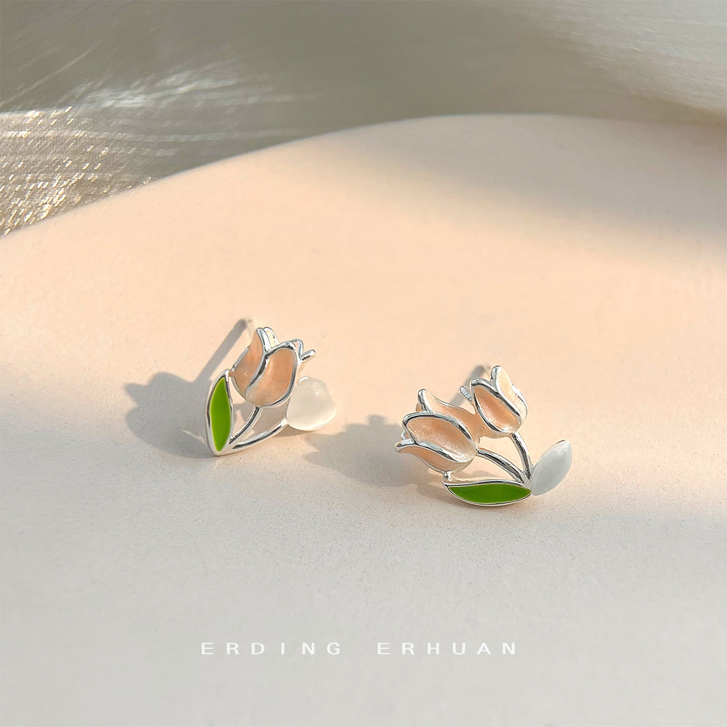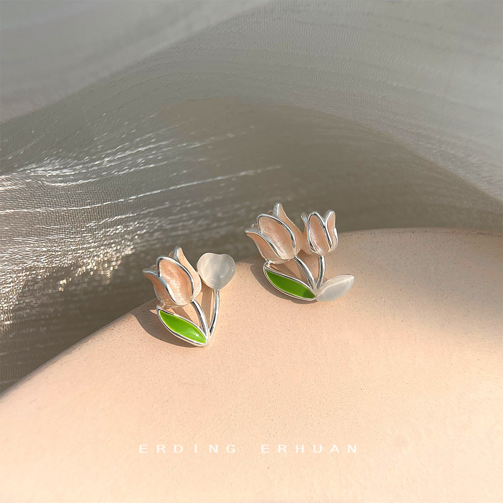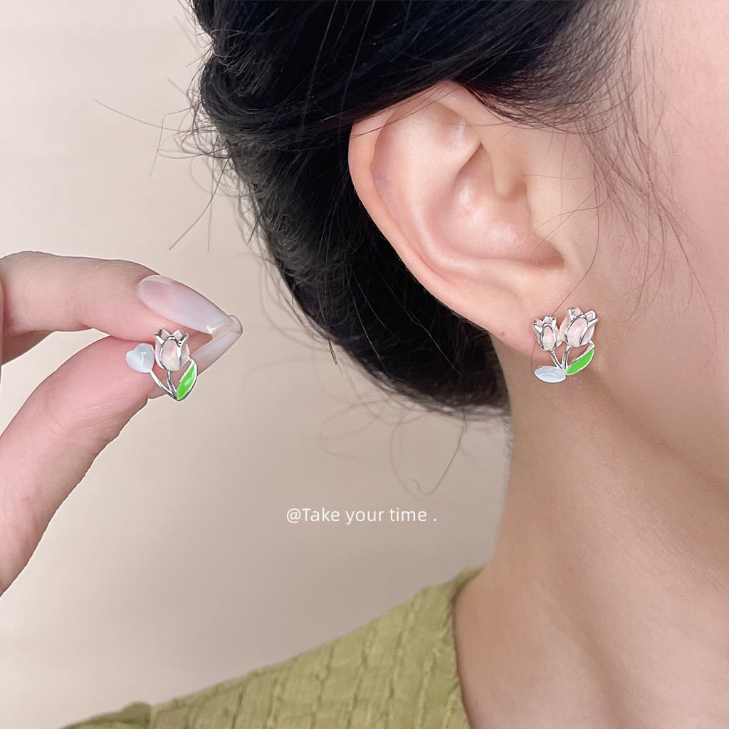 C廠【4720】清新甜美不對稱玻璃貓眼石鬱金香花朵耳環女氣質優雅可愛新款耳環 24.08-3