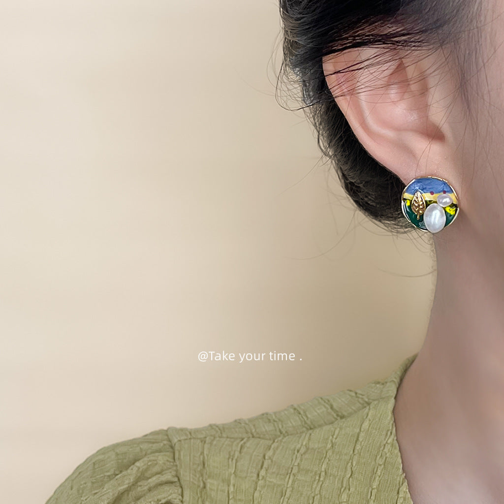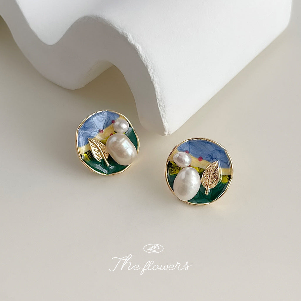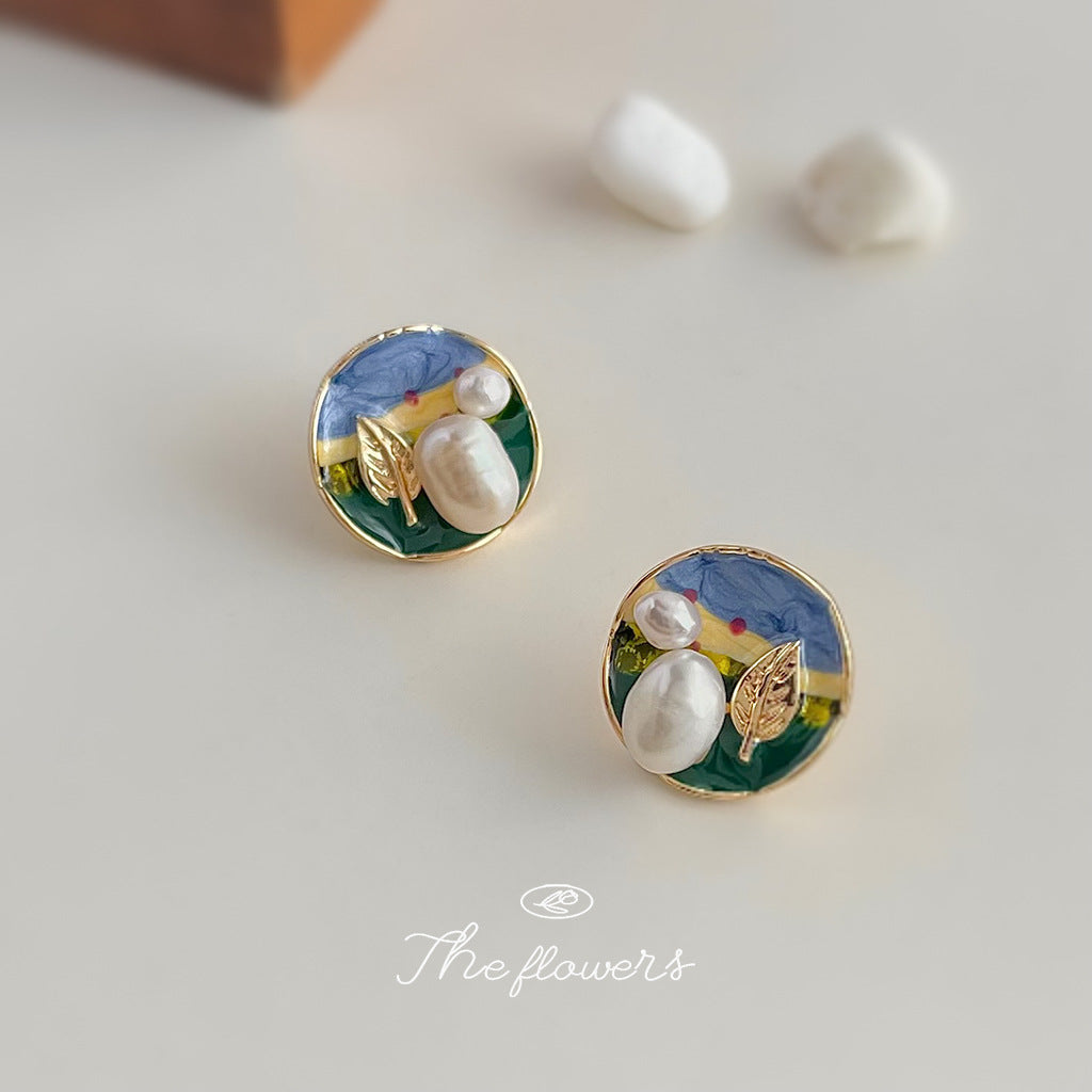 C廠【4744】異形巴洛克不規則淡水珍珠油畫質感圓形幾何鍍14K耳環女耳飾 24.08-4
