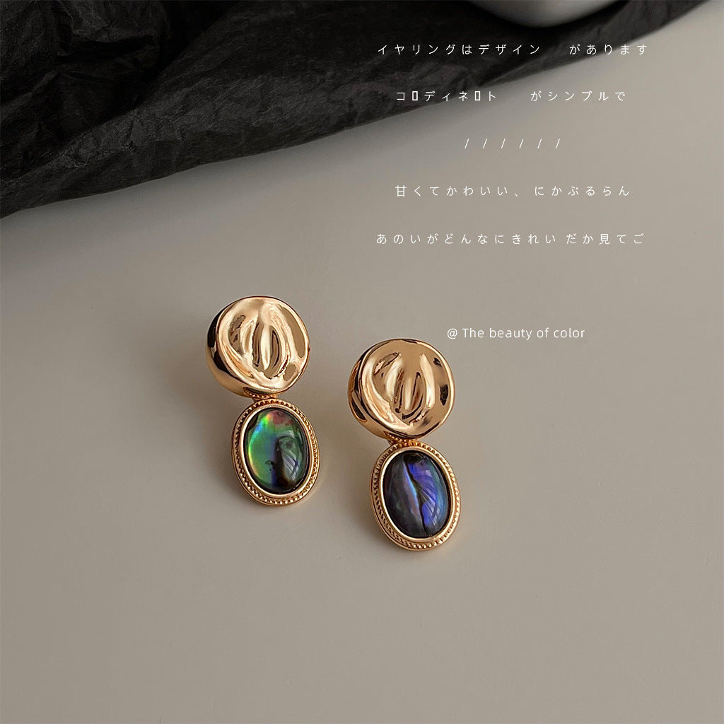 C廠【4746】法式復古鮑魚貝鍍14K金屬感幾何橢圓新款耳環高級感式耳環耳環 24.08-4