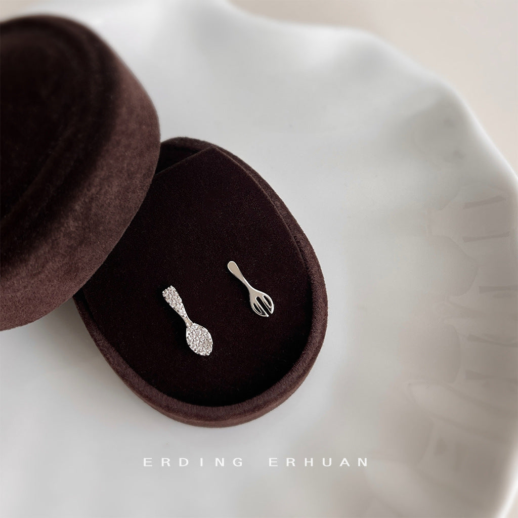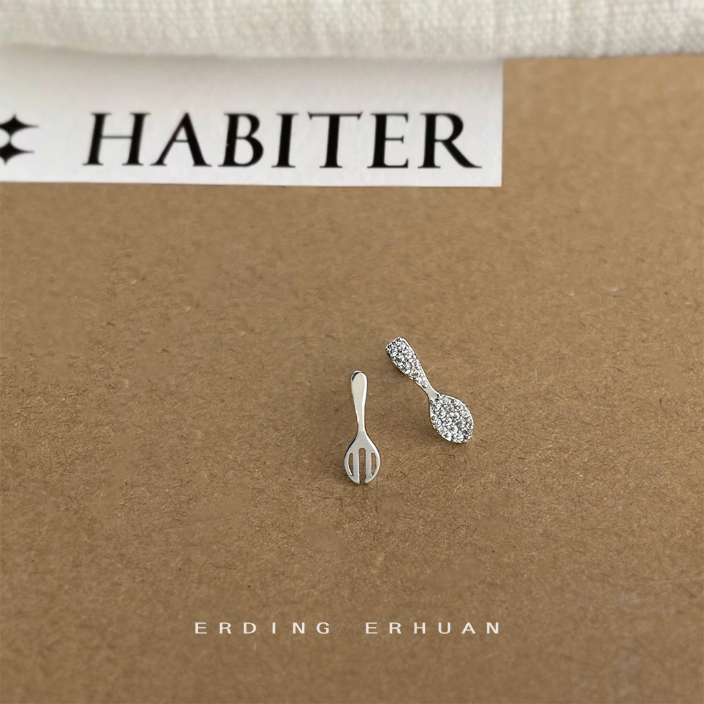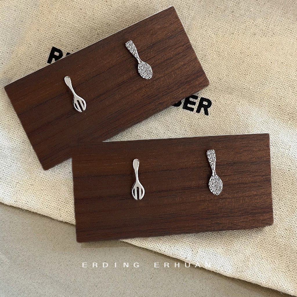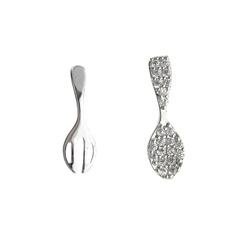 C廠【4823】不對稱設計感微鑲鋯石迷你小巧湯匙叉子趣味可愛小耳環耳飾女 24.09-1