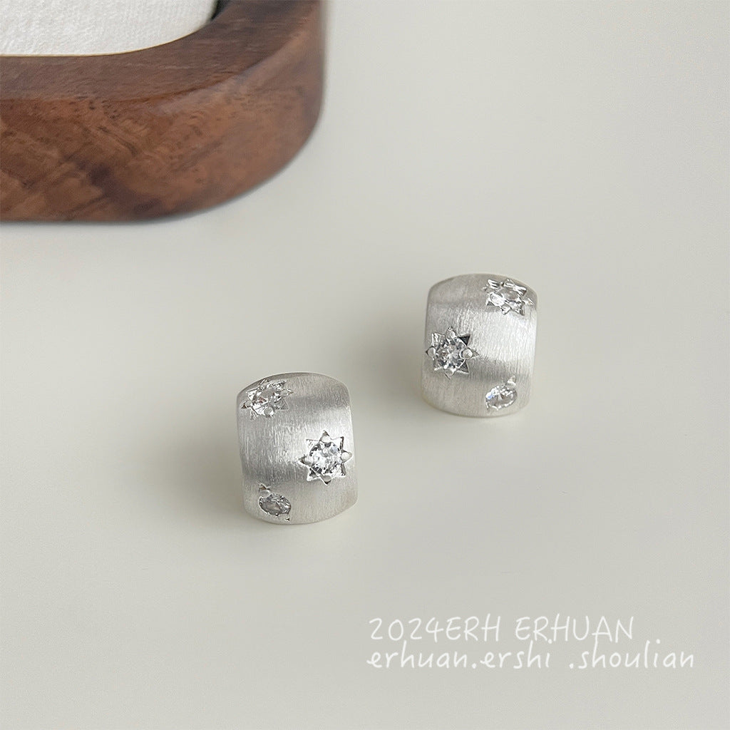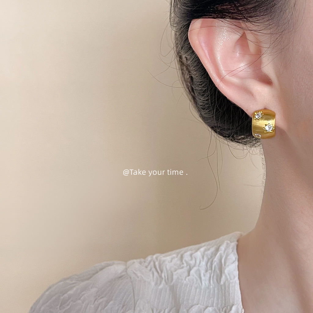 C廠【4824】微鑲鋯石鍍14K拉絲質感霧面半彎幾何耳環女款高級感輕奢風耳飾 24.09-1