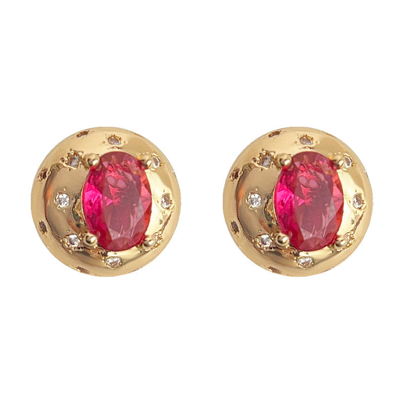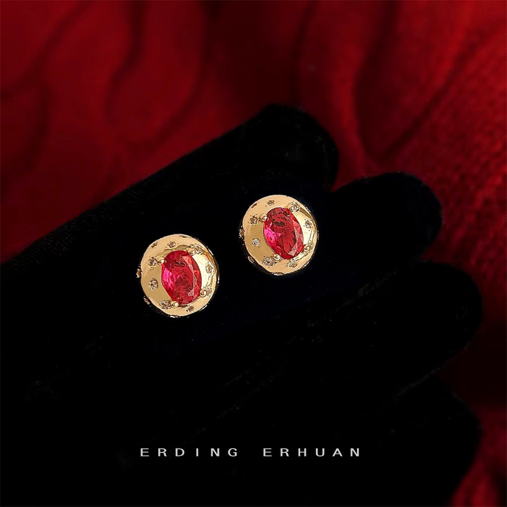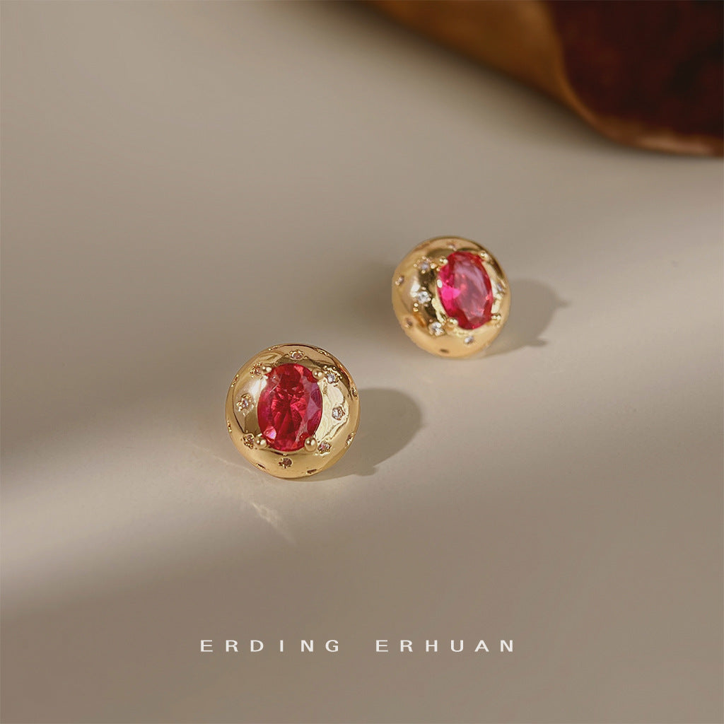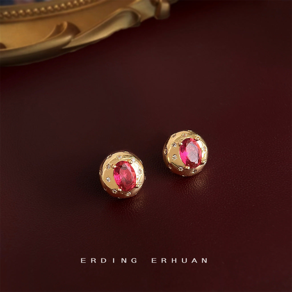 C廠【4842】法式復古宮廷鍍14K鑲嵌玫紅色鋯石耳環 橢圓幾何設計師款耳飾 24.09-3