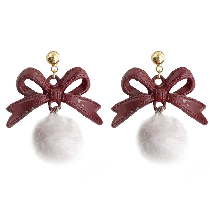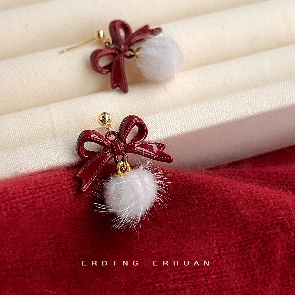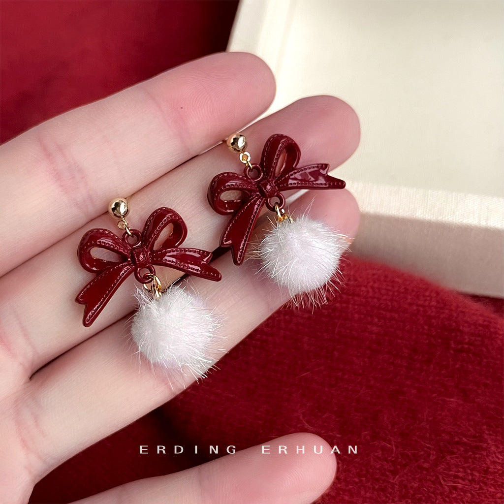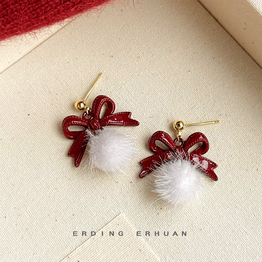 C廠【4921】安可拉紅2024冬天款酒紅色蝴蝶結毛球耳環復古甜美蝴蝶結耳環 24.09-4