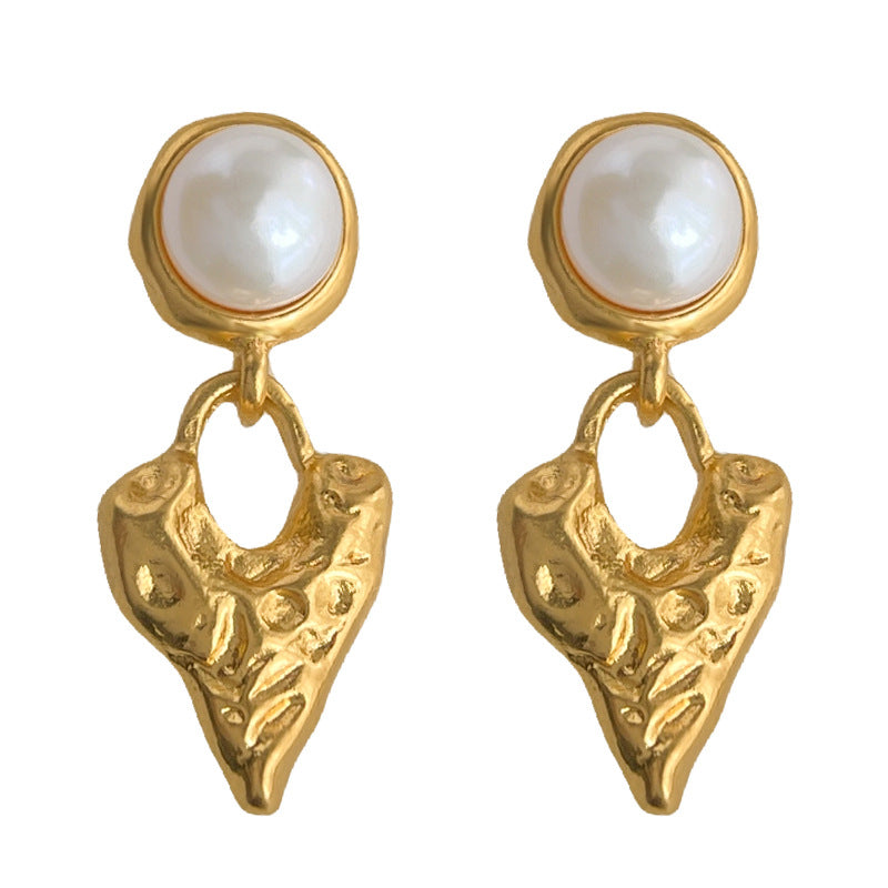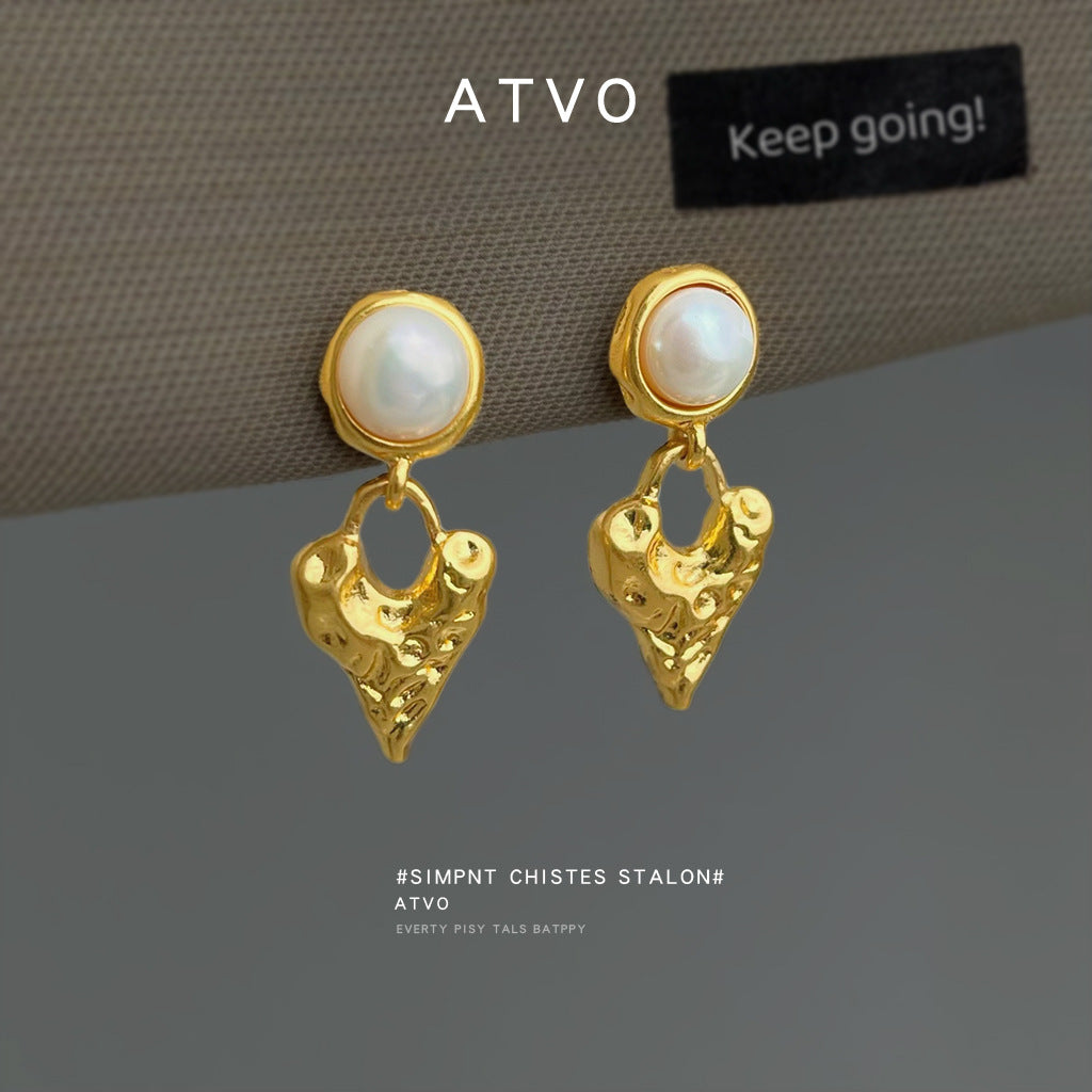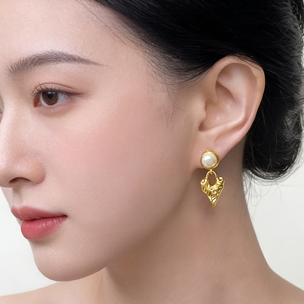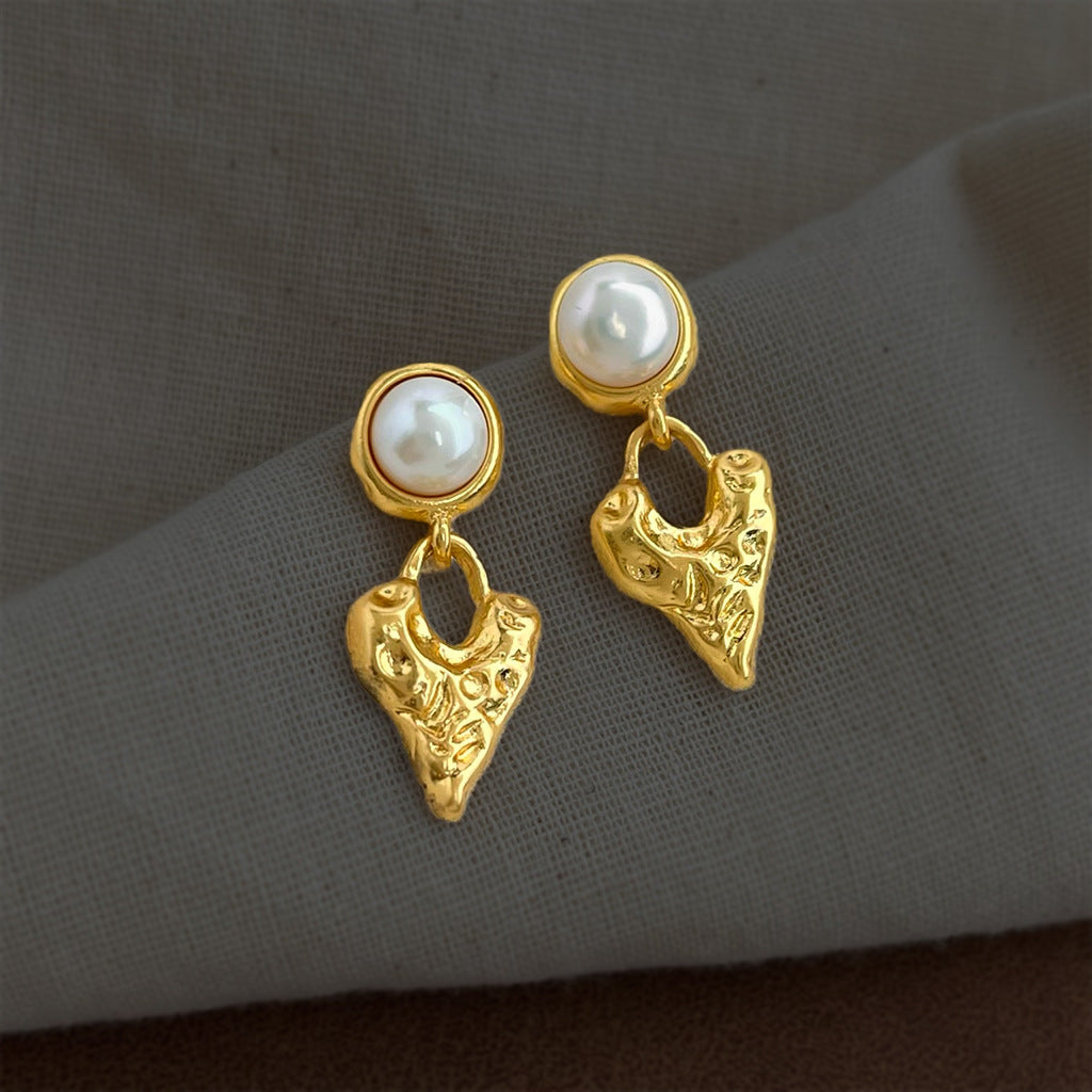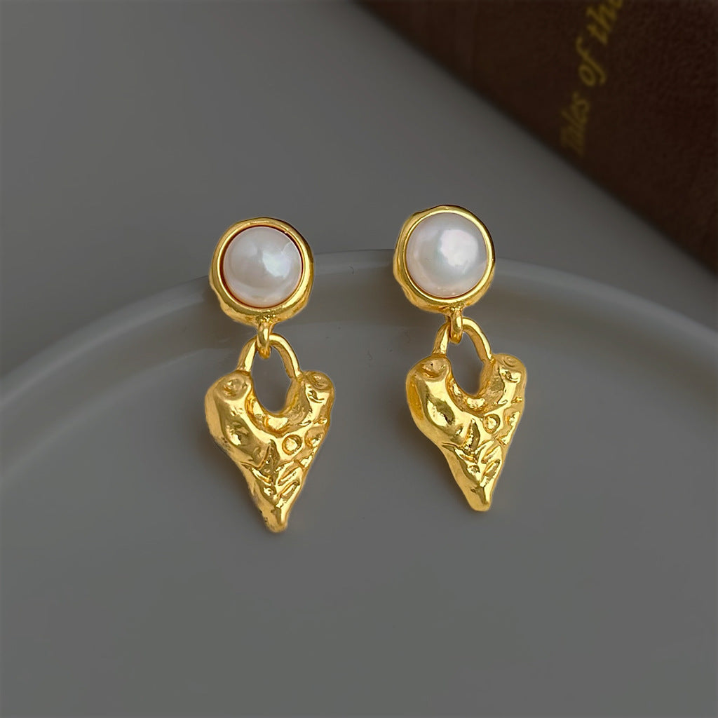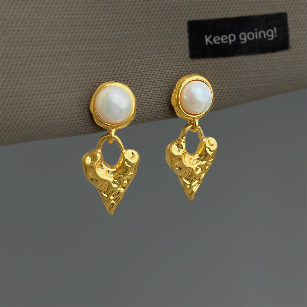 A廠 【4929】淡水珍珠肌理感鍍18K熔岩金屬愛心珍珠飾品法式復古耳環耳環 26.03-3