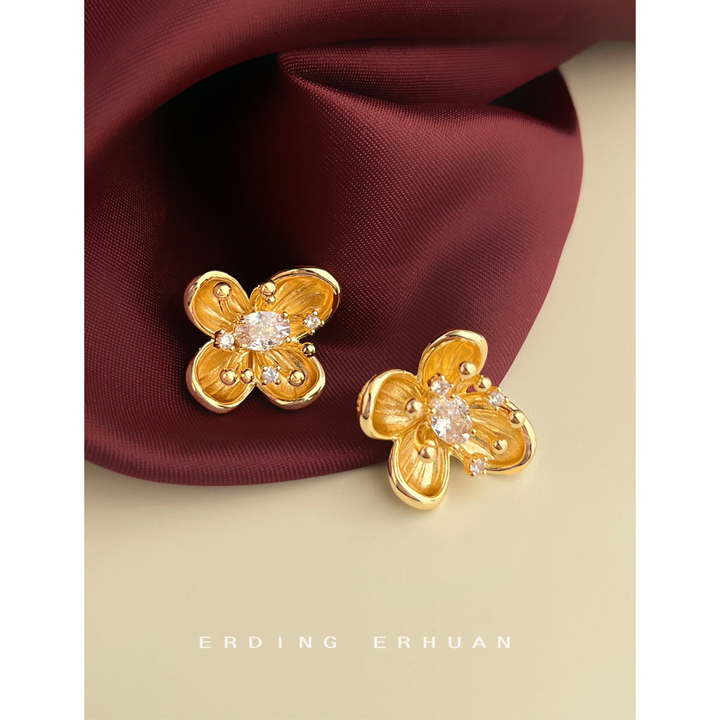 C廠【5104】梅花香自苦寒來~文藝復古電鍍14K銀針花朵耳環女鑲嵌鋯石耳飾 24.11-2