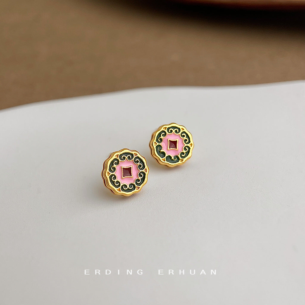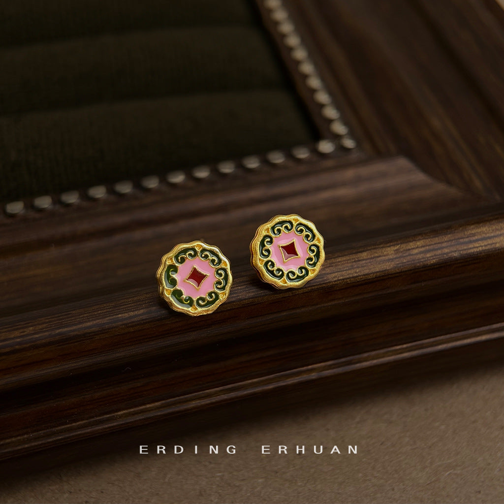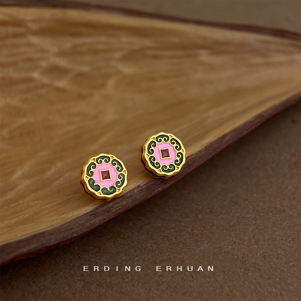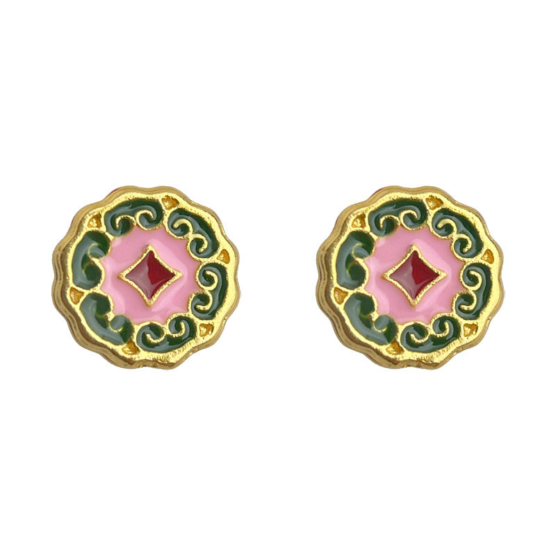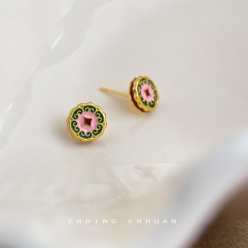 C廠【5452】新中式925銀針鍍14K琺瑯滴釉簡約小巧通勤百搭圓形彩銅錢耳環耳飾 25.02-3