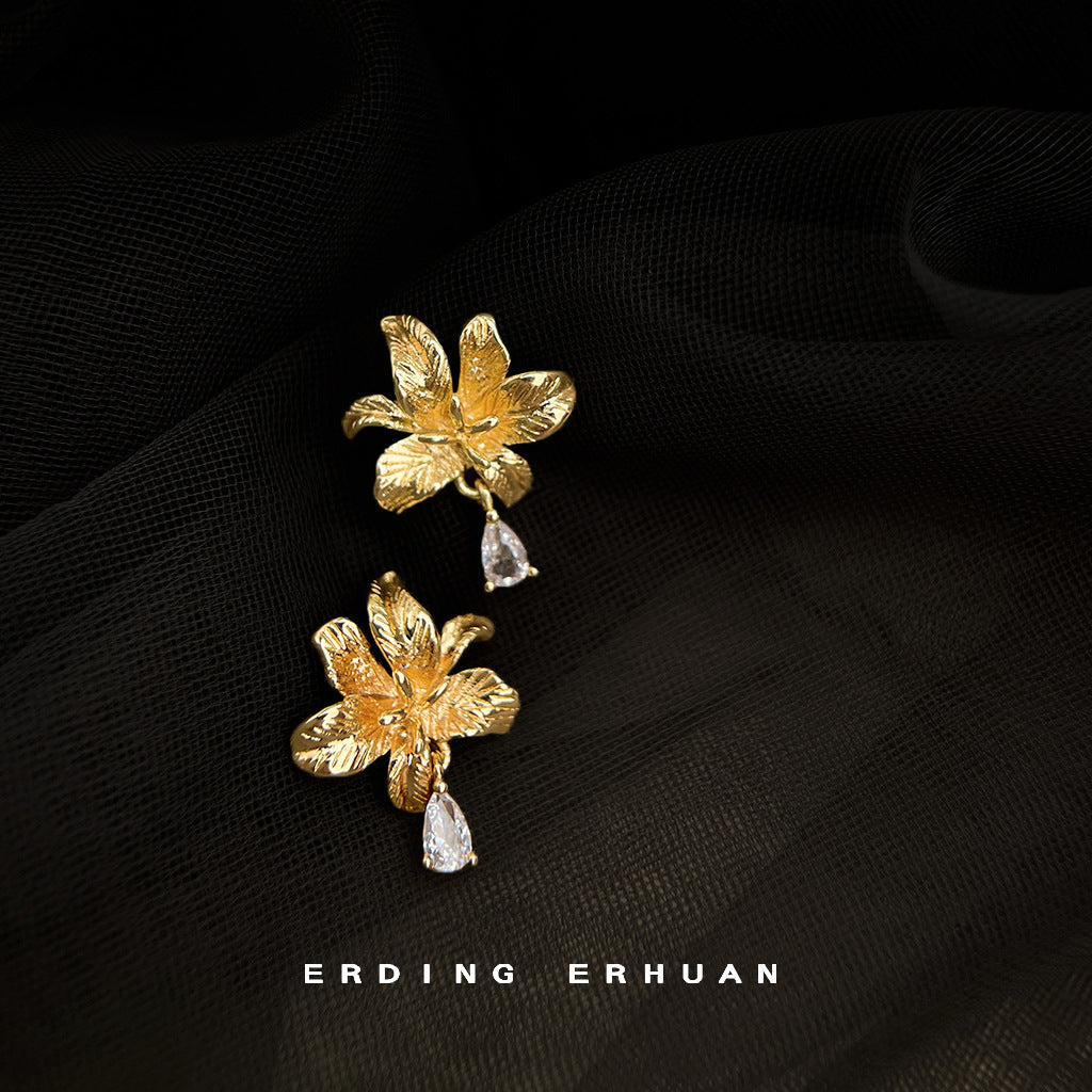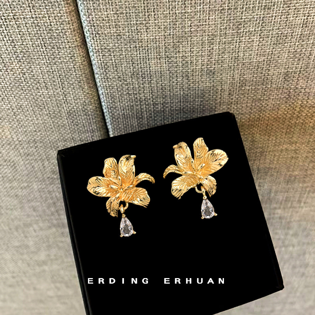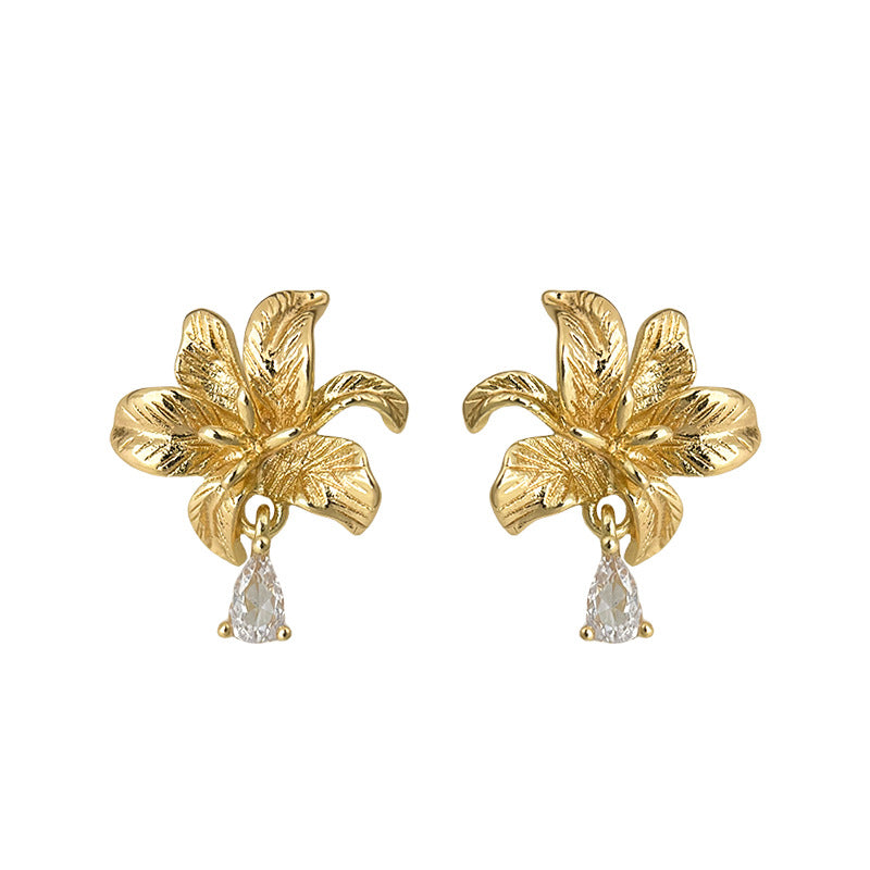 C廠【5487】中古vintage百合露珠花朵S925銀針耳環鍍14K保色氣質優雅新耳飾 25.02-3
