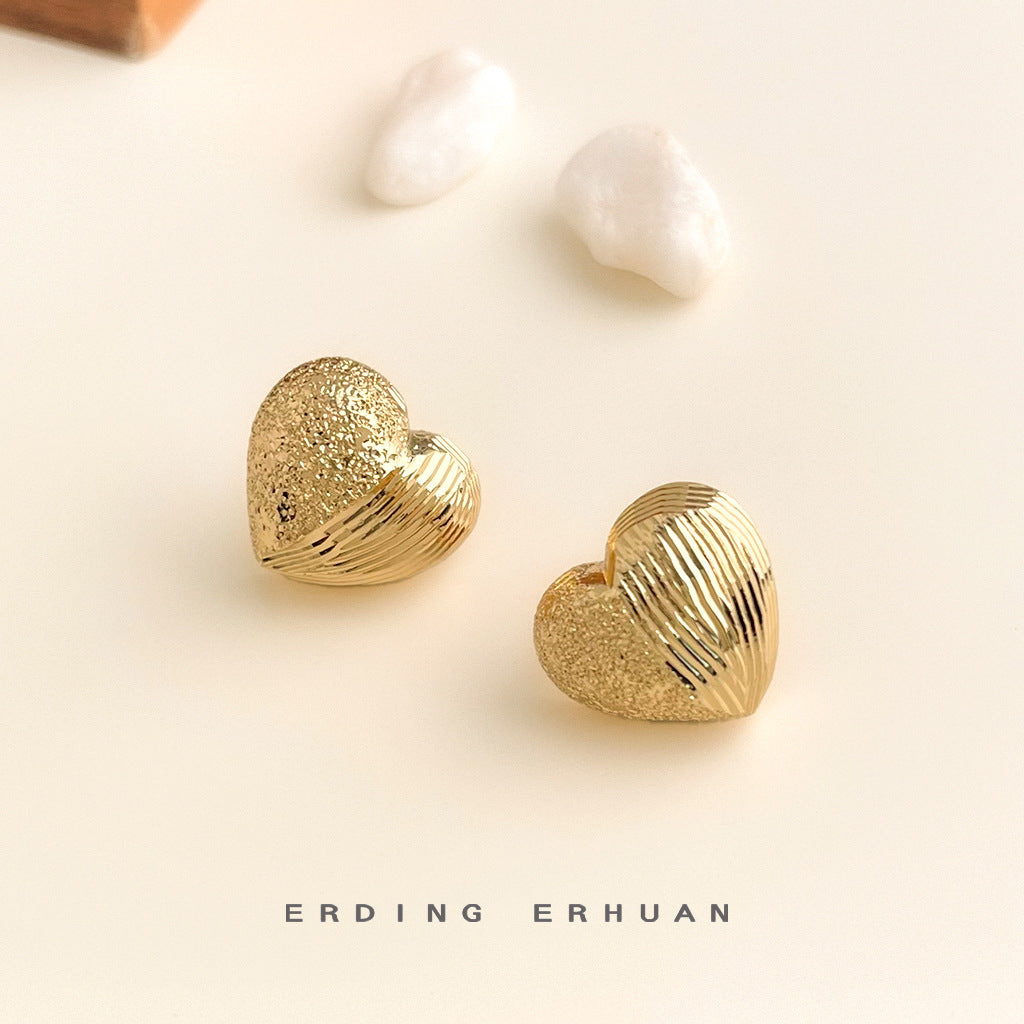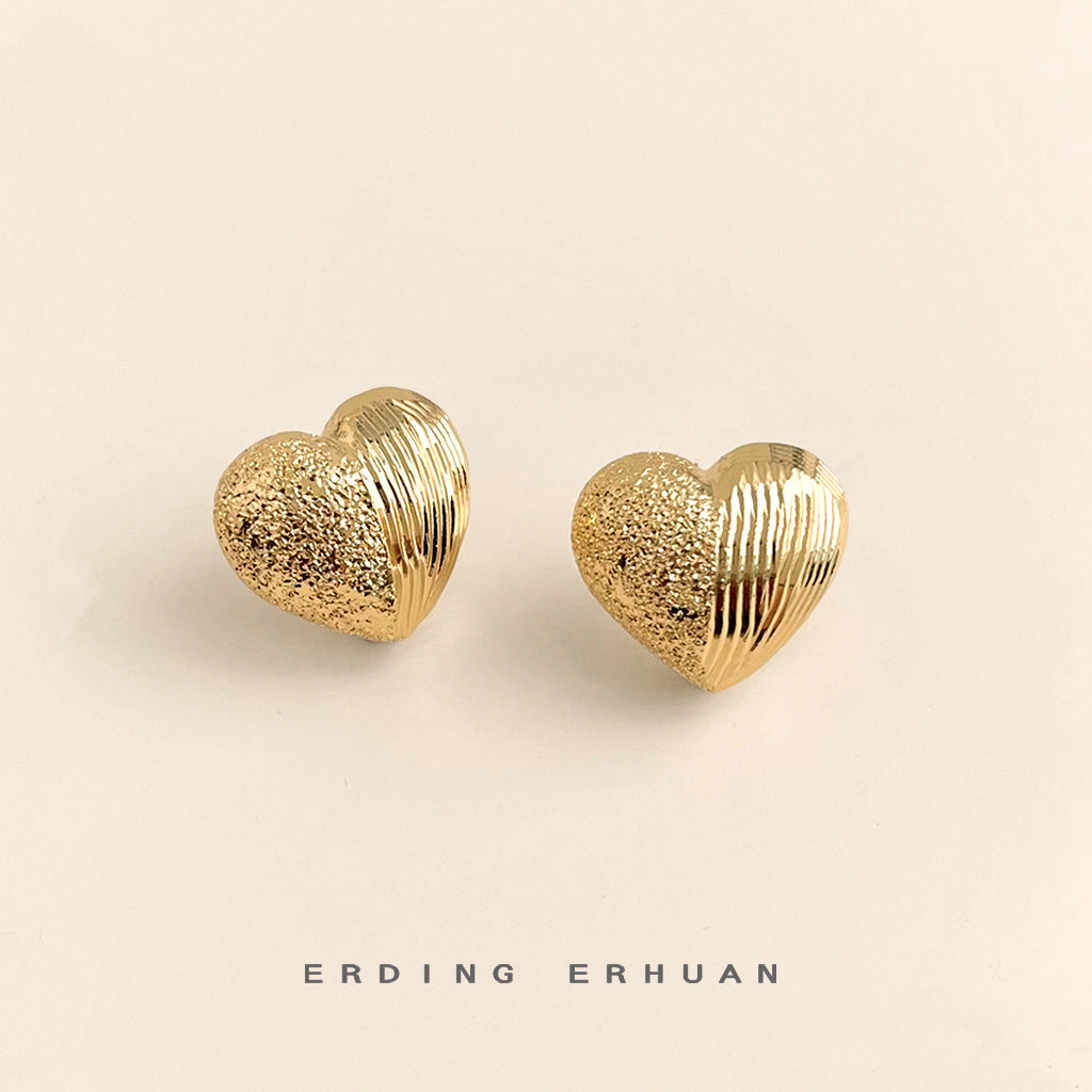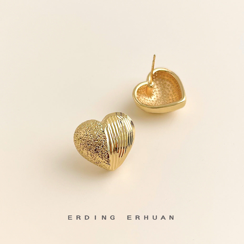 C廠【5489】手工錘紋釘砂紋雙拼切面工藝鍍14K心形耳飾簡約新款耳環飾品 25.02-2